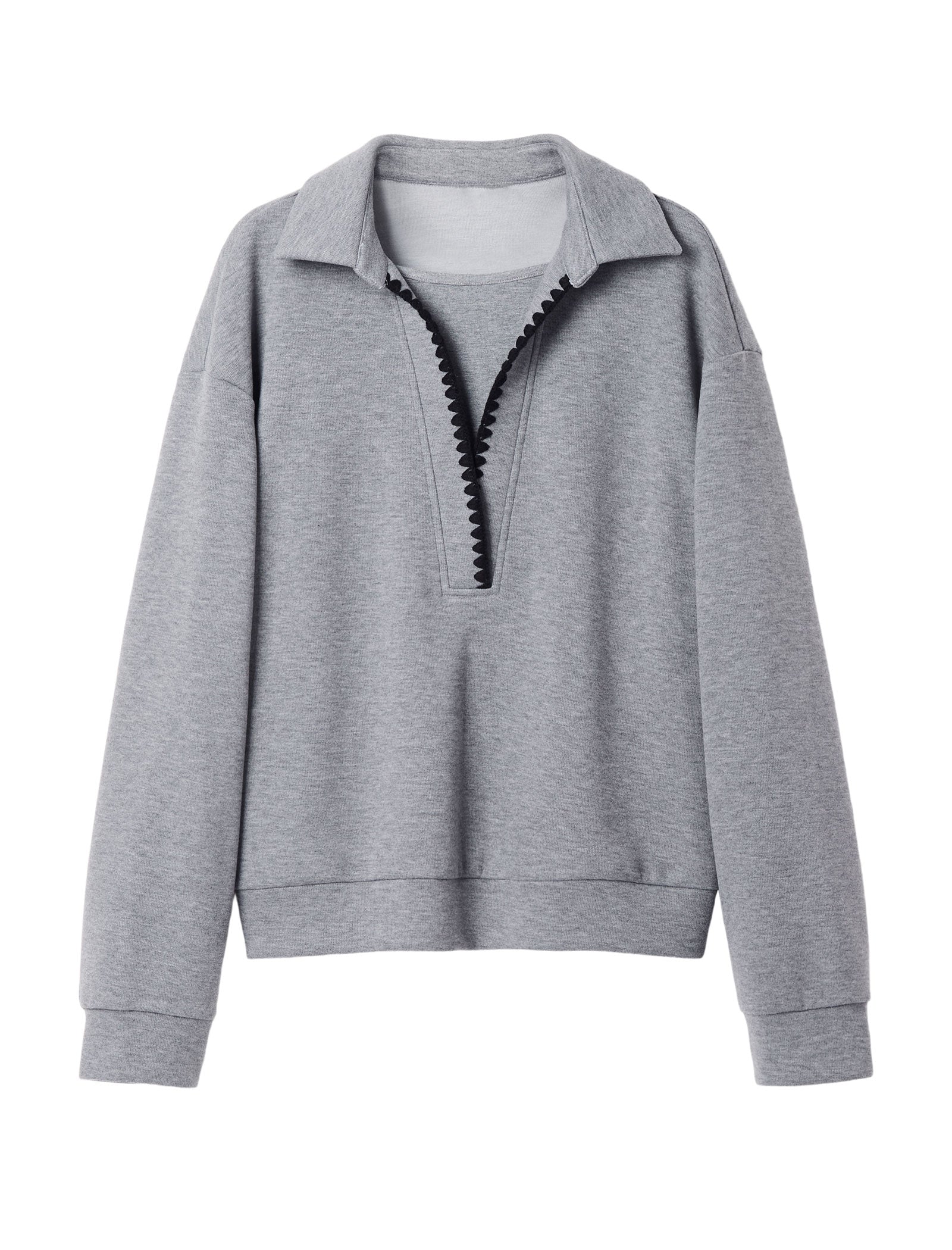 Upgrade your casual look with this gray polo-collar sweatshirt! The soft fabric keeps you comfy, and the polo collar adds a polished touch. The black contrast trim along the neckline gives it a stylish detail. With a relaxed fit and long sleeves, it's perfect for pairing with jeans or leggings. Great for everyday wear—stay cozy and chic all day long!