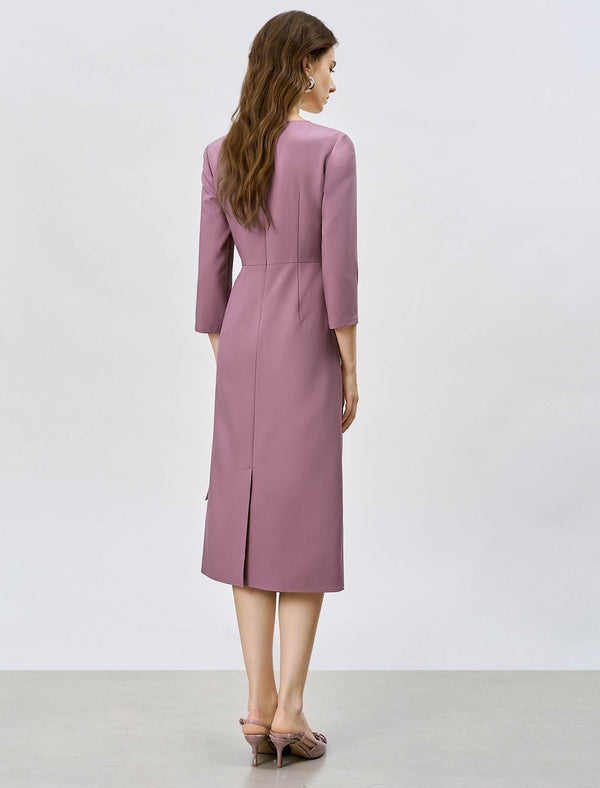 This elegant midi dress comes in a soft, sophisticated dusty rose hue, crafted from a smooth, wrinkle-resistant fabric that holds its shape beautifully. It features a classic crew neck, three-quarter sleeves, and a flattering wrap-front design with a self-tie belt that cinches the waist for a tailored silhouette. A subtle back slit adds ease of movement, making it perfect for all-day wear.