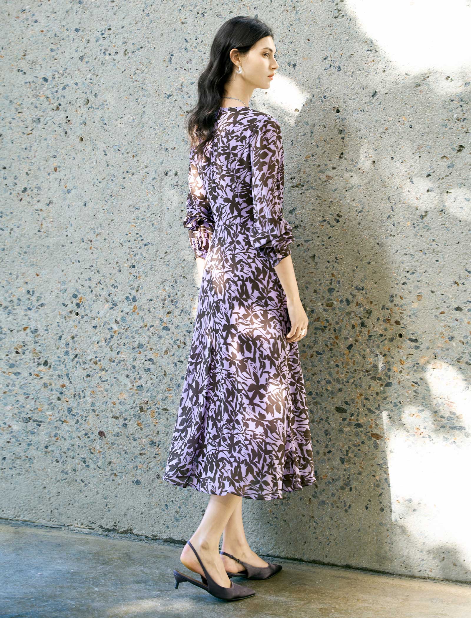 This flowy midi dress is crafted from lightweight, semi-sheer fabric in a soft lavender hue, adorned with a bold brown floral print for a striking, modern look. It features a V-neckline, a twisted front detail at the waist. The A-line skirt falls to a midi length, creating a graceful, feminine silhouette.