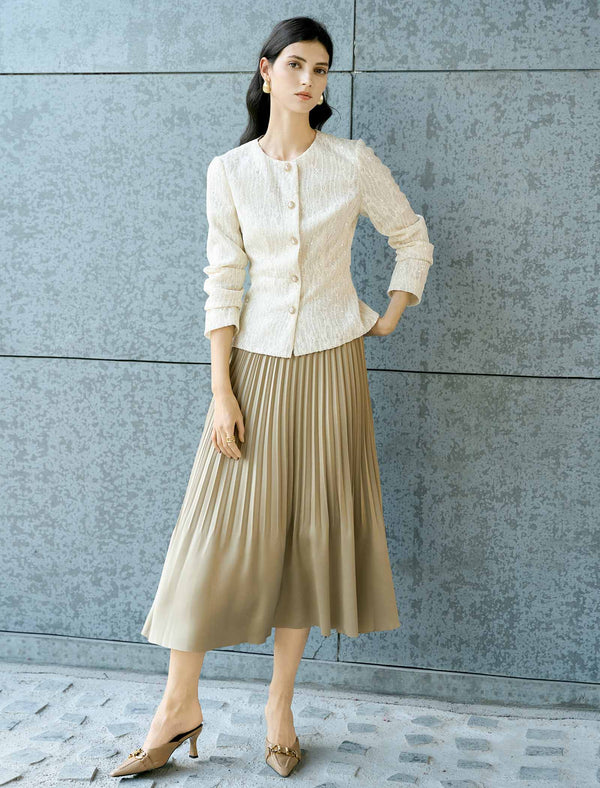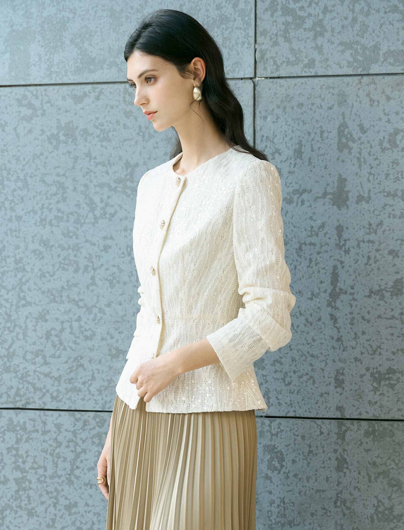 This elegant cropped jacket is crafted from soft ivory lace with delicate sequin detailing that shimmers gently in the light. It features a classic round neck, eye-catching gold crystal buttons, and a tailored fit for a polished silhouette.