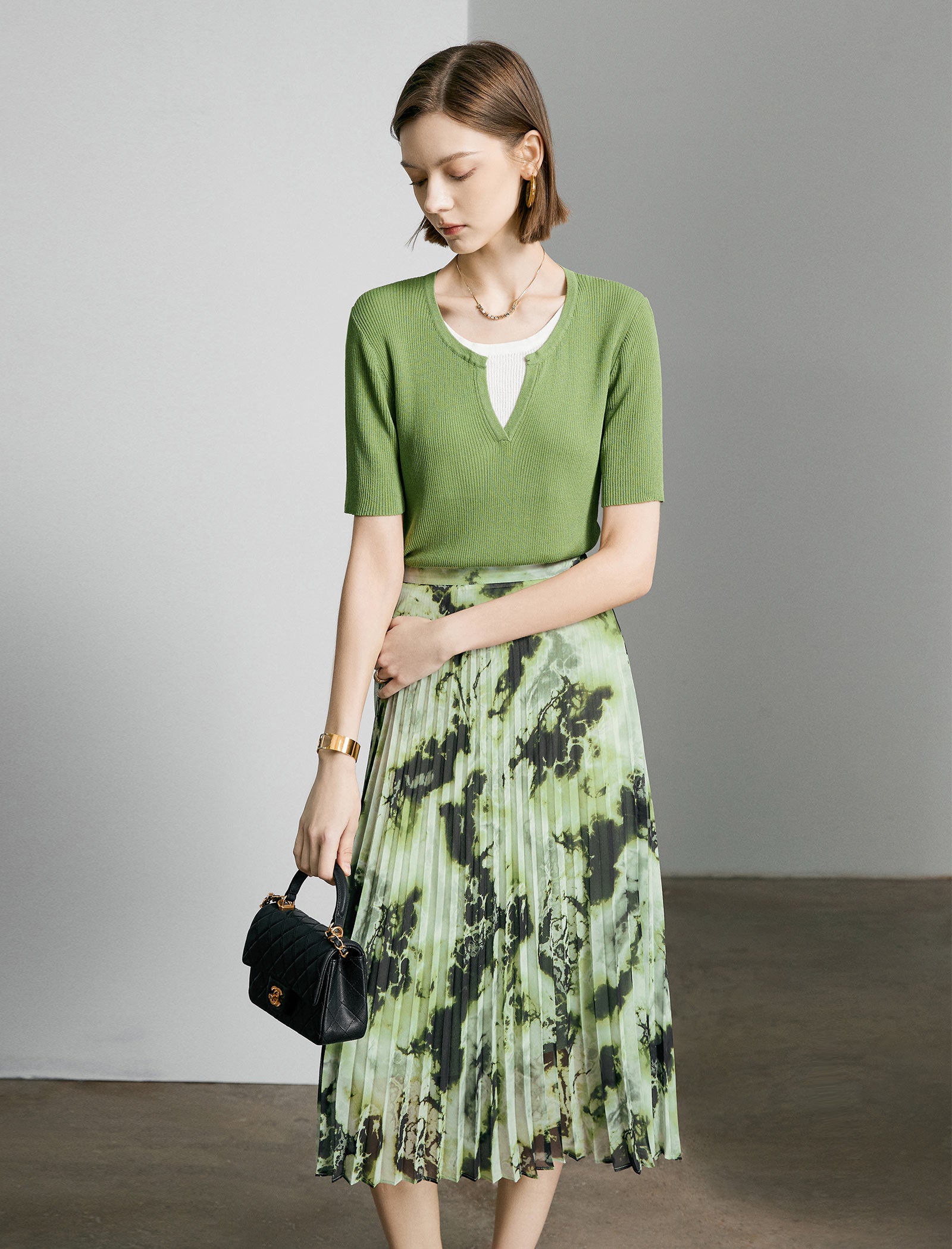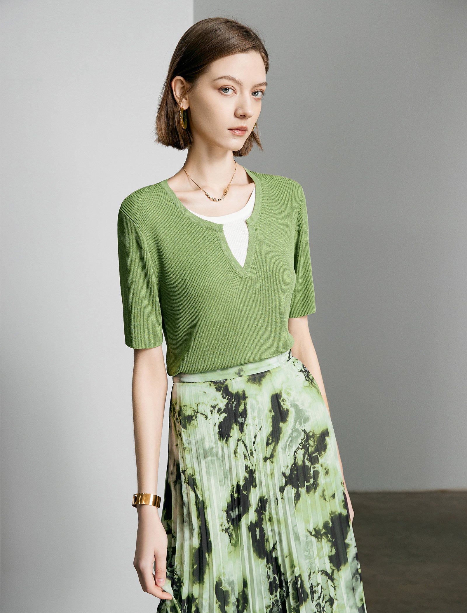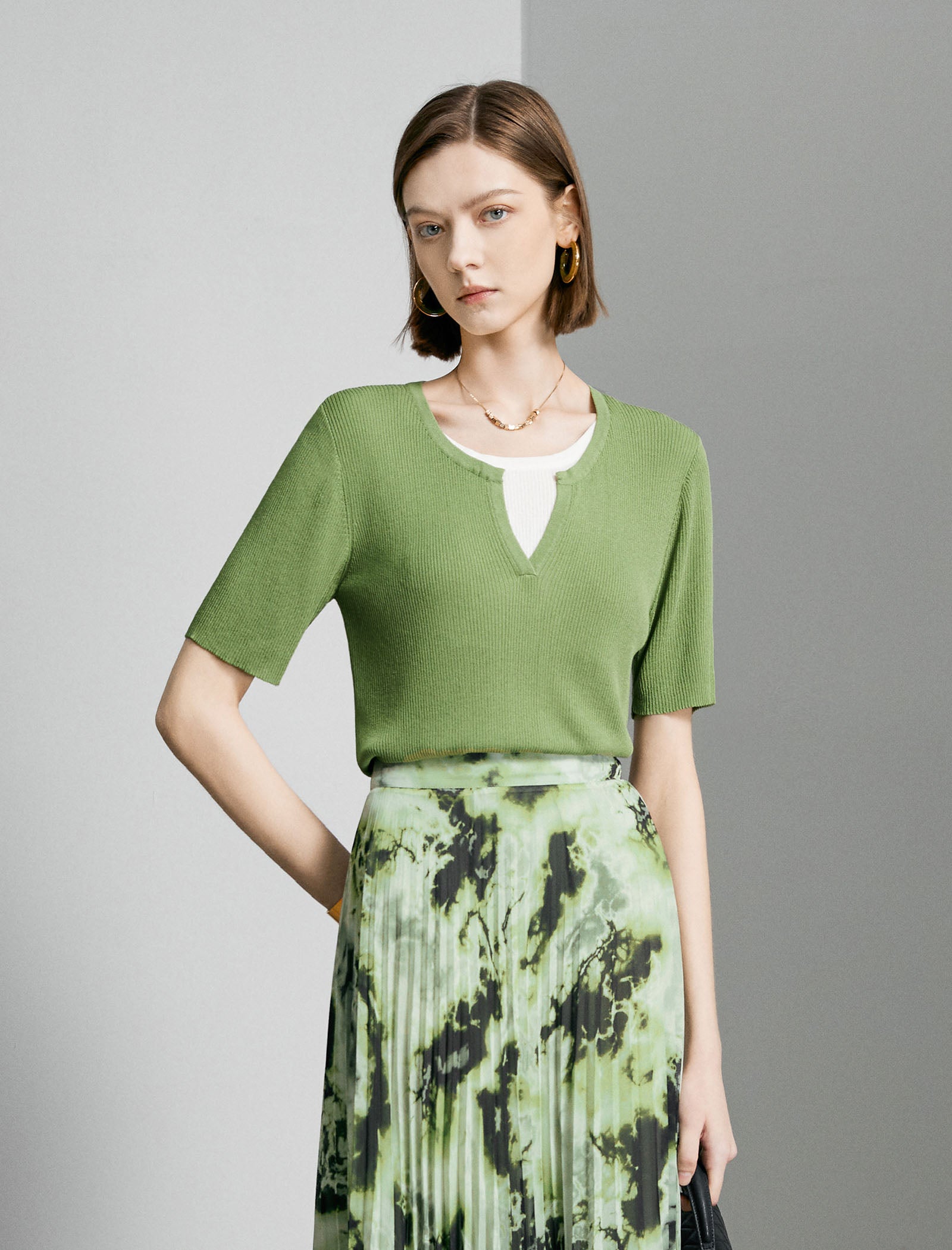 This fresh knit top is crafted from soft, stretchy ribbed fabric in a vibrant leaf green hue, featuring a trendy split V-neck and a layered design with a contrasting white inner panel for a modern, polished look. It has a slim, fitted silhouette and elbow-length sleeves that feel comfortable and stylish.