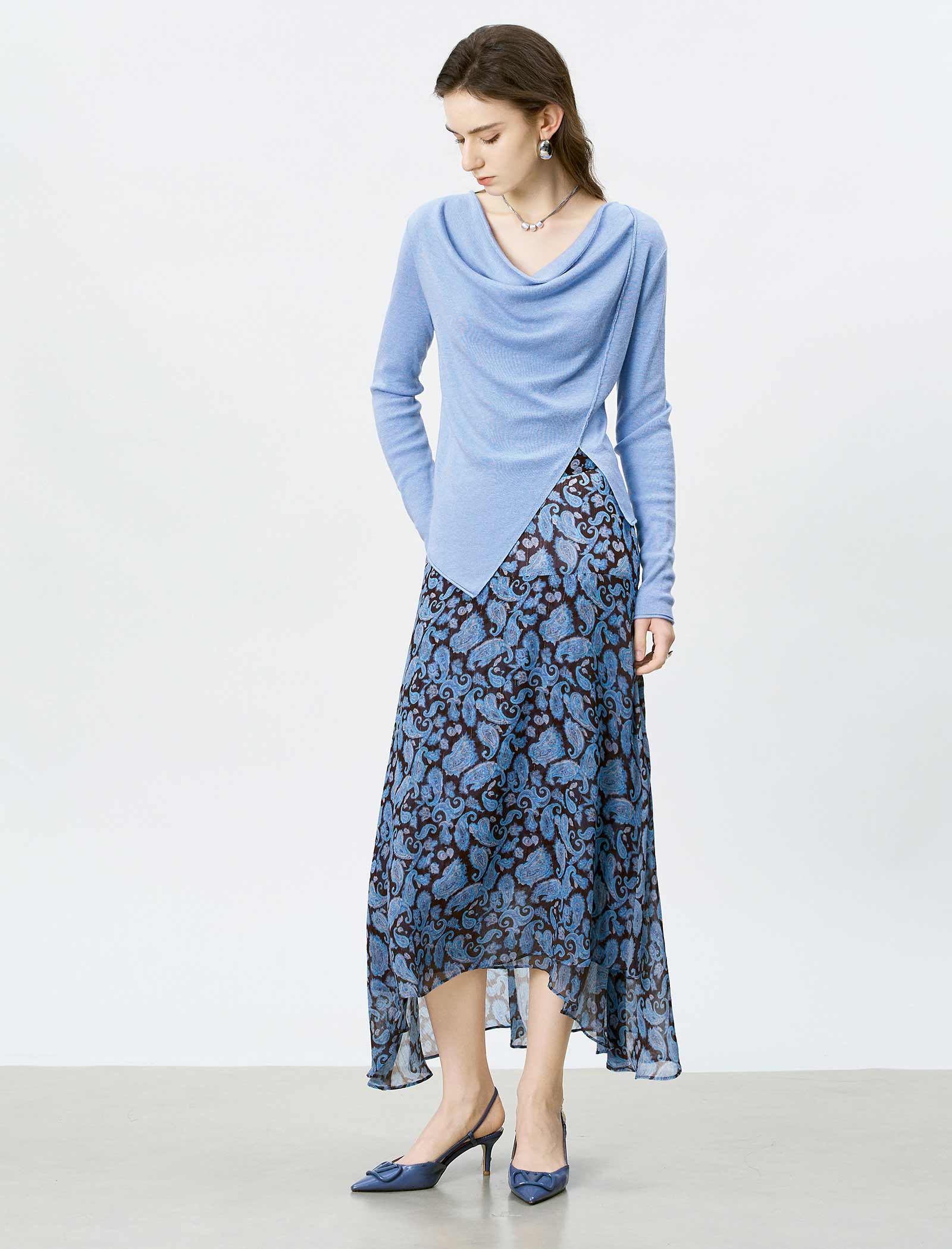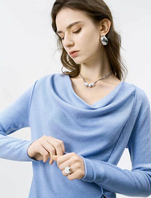 This sleek knit top is crafted from a soft, lightweight fabric in a soft light blue hue, featuring a flattering cowl neckline that drapes elegantly across the chest. It has long, fitted sleeves and a unique asymmetrical hem with a side slit, creating a modern, tailored silhouette that hugs the body in all the right places.