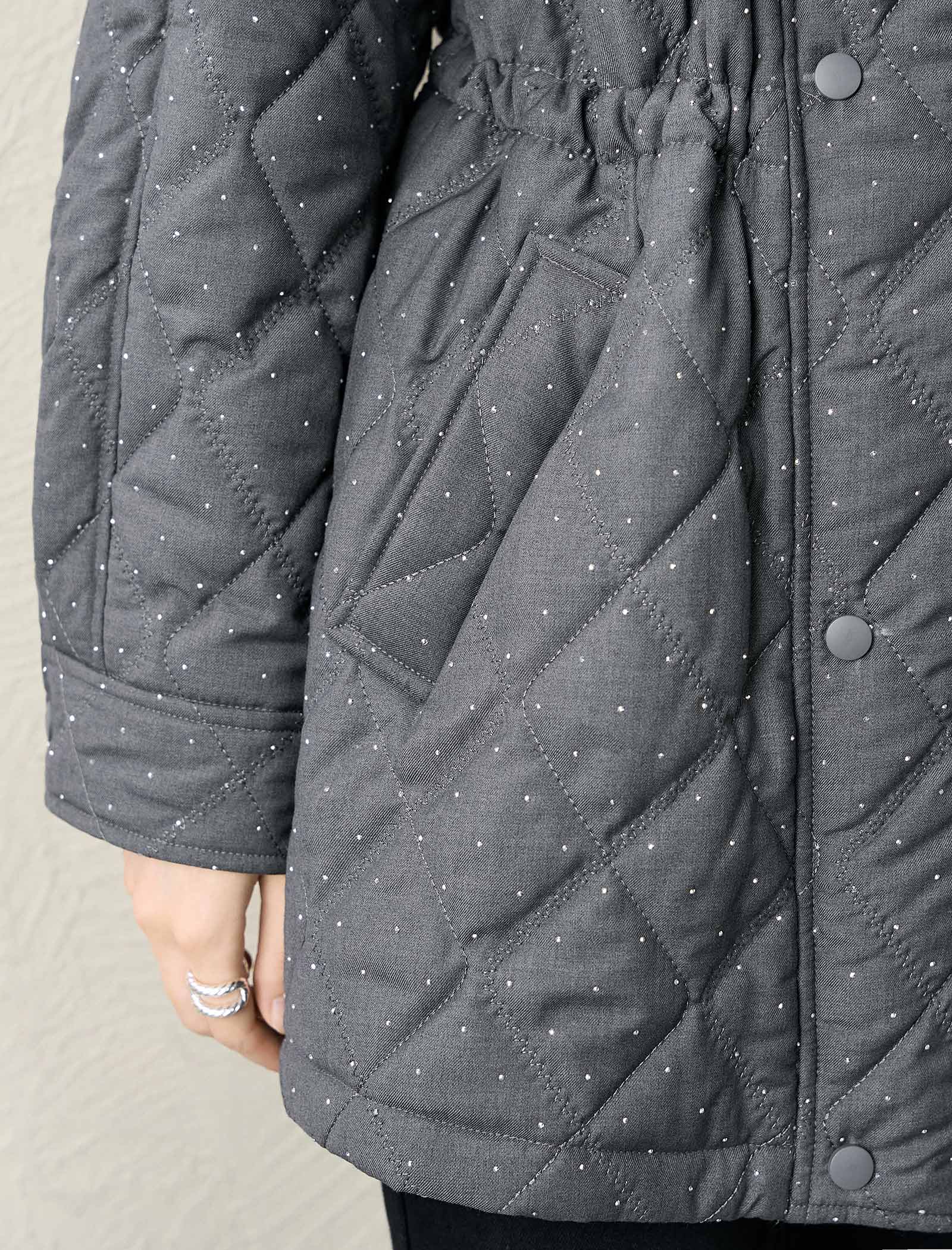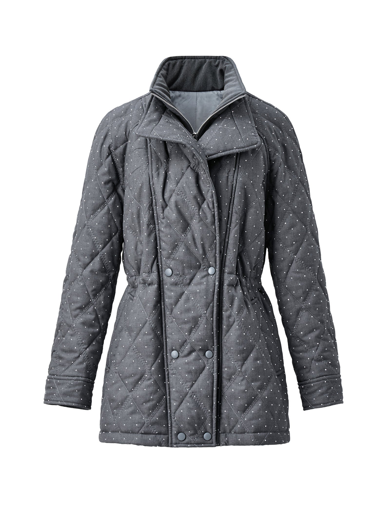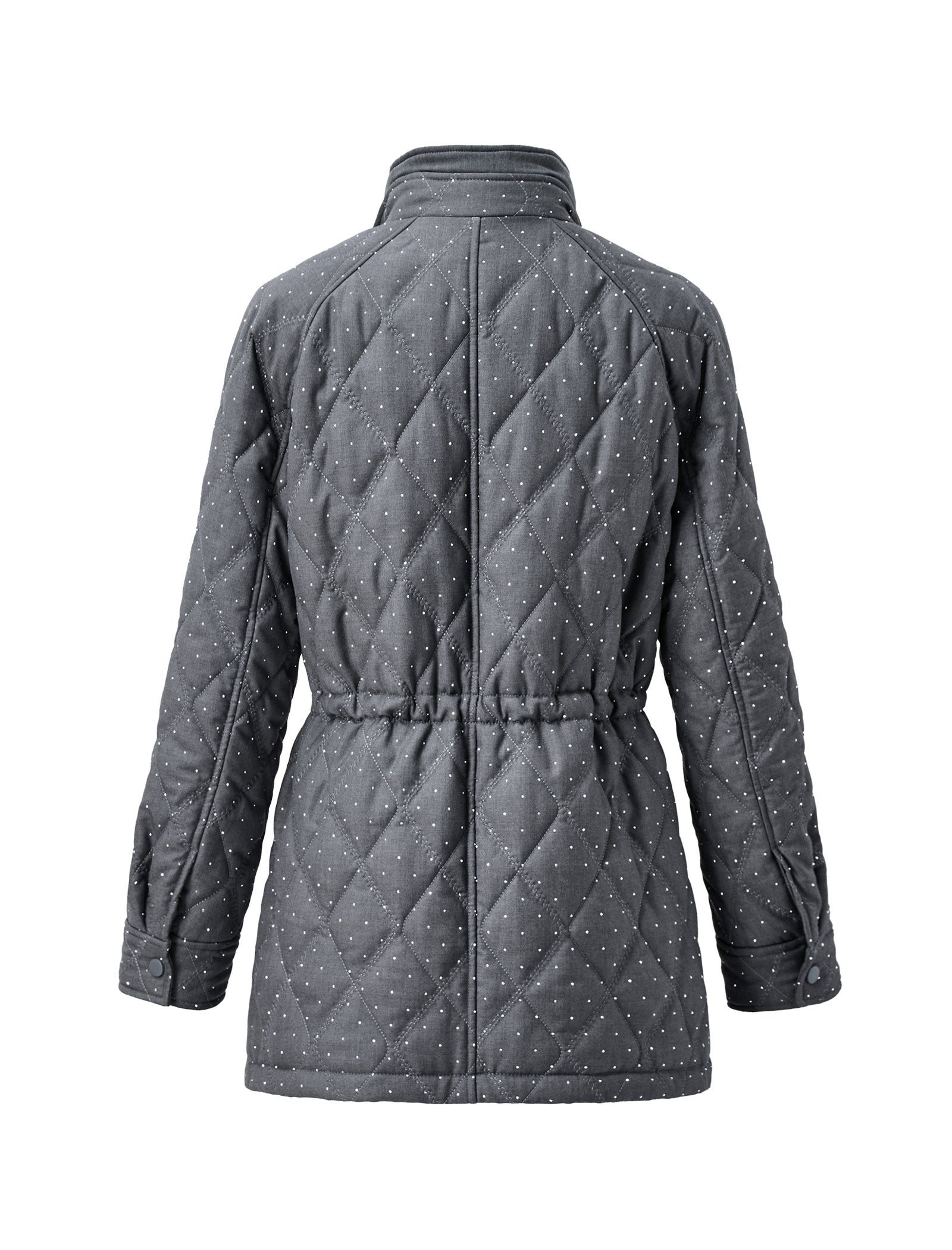 Stay warm and stylish with this grey quilted coat. It features a diamond quilt pattern and subtle polka dots that add a fun touch. The stand-up collar, button front, and drawstring waist make it both cozy and flattering. Perfect for chilly days, you can layer it over sweaters or tops—this coat is an easy way to stay comfy and chic.
