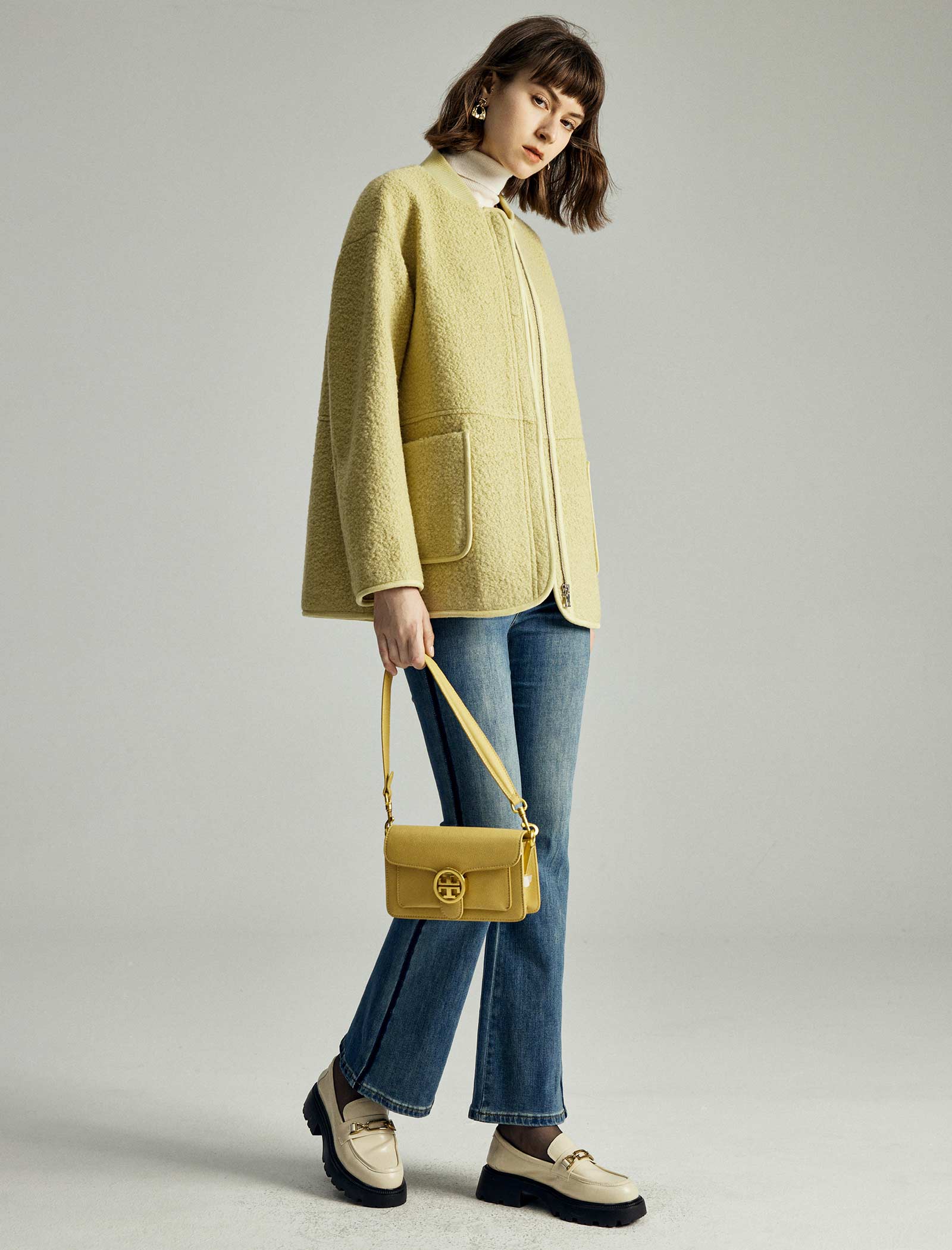 Stay cozy and stylish with this wool-blend bomber jacket. It features a zip-front closure, a classic ribbed collar, and large pockets for convenience. The soft wool-blend fabric keeps you warm, while the relaxed fit makes it easy to layer over sweaters or tops. Available in colors like light yellow, grey, and black-grey tweed, this jacket is a chic choice for both casual outings and everyday wear.