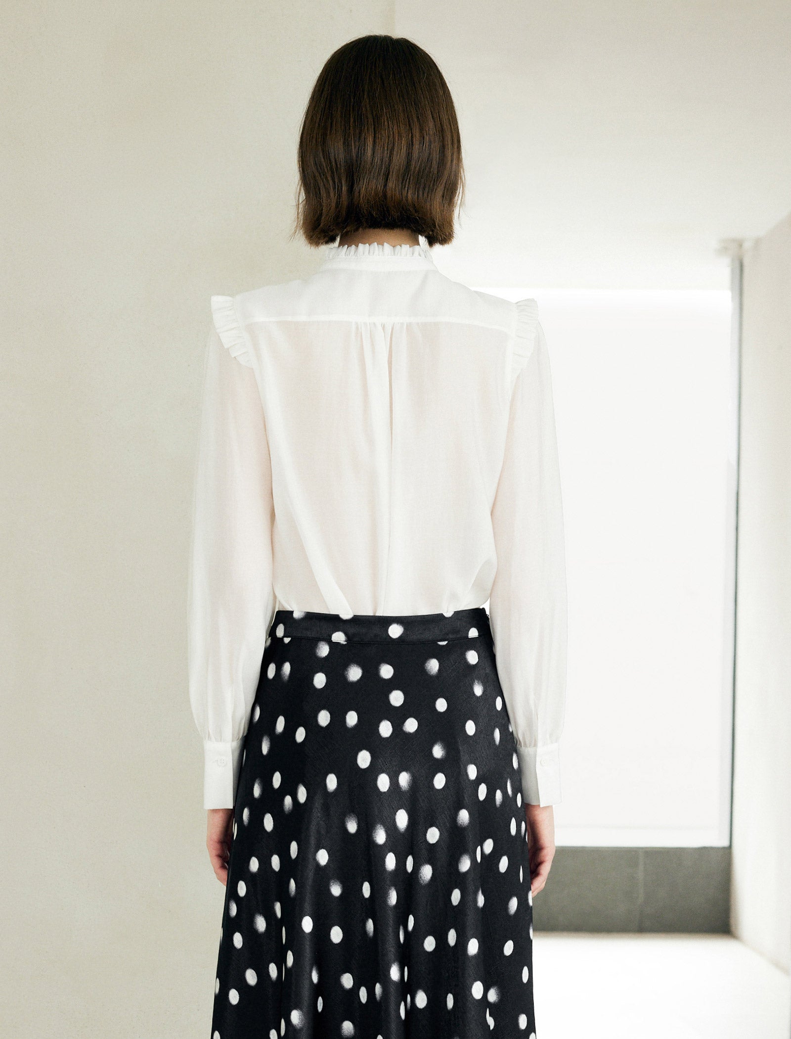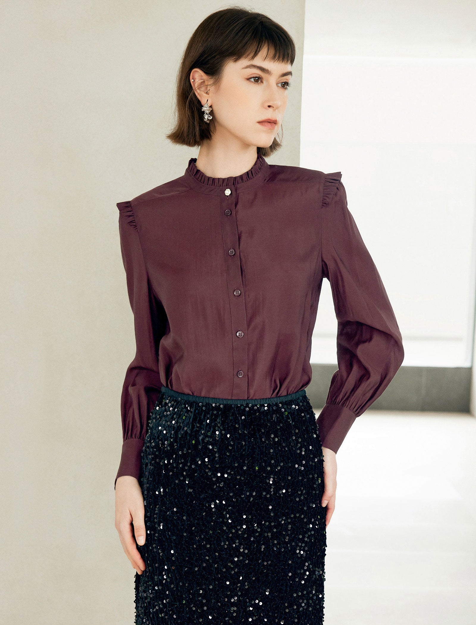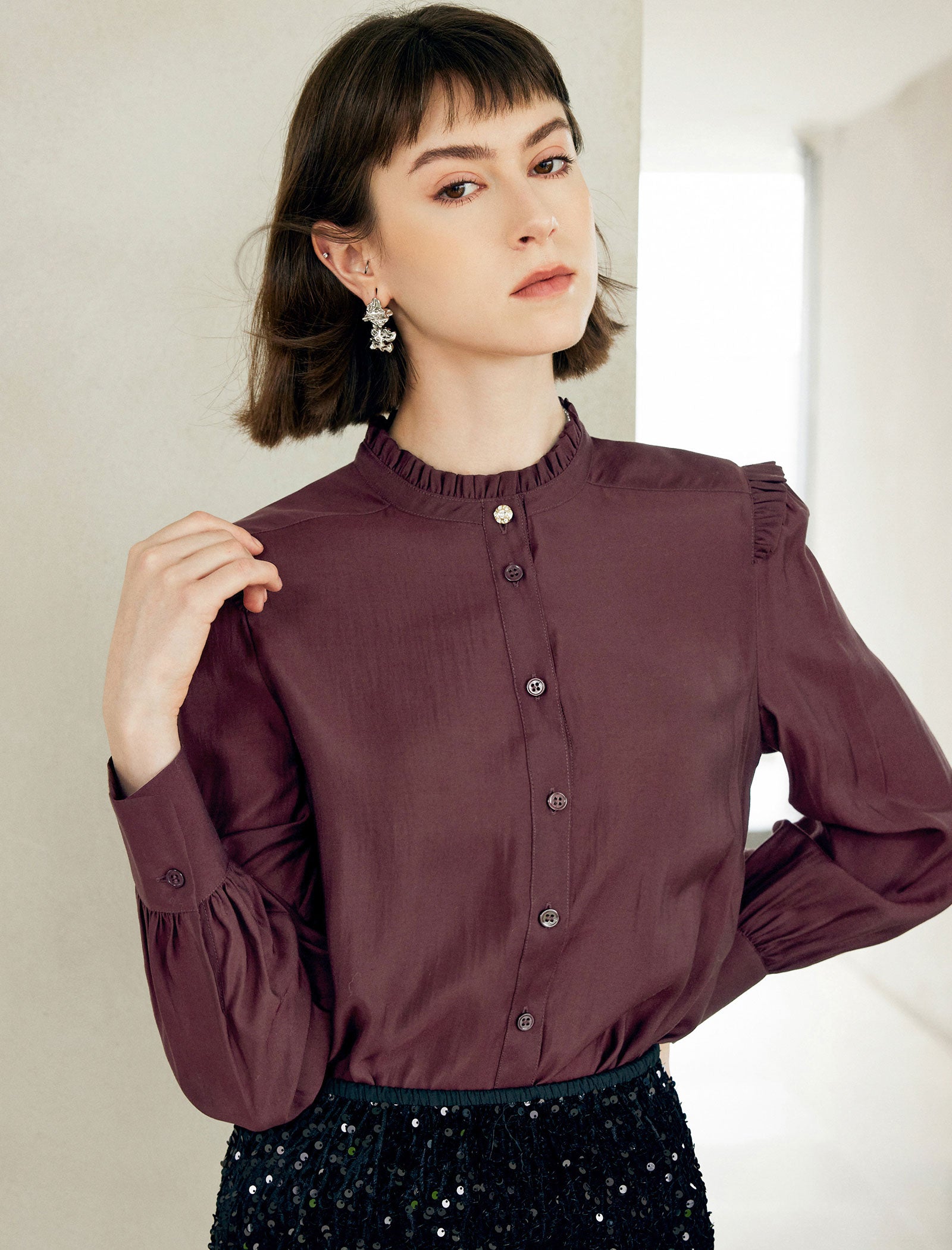 Elegant Ruffled Stand Collar Long-Sleeve Blouse