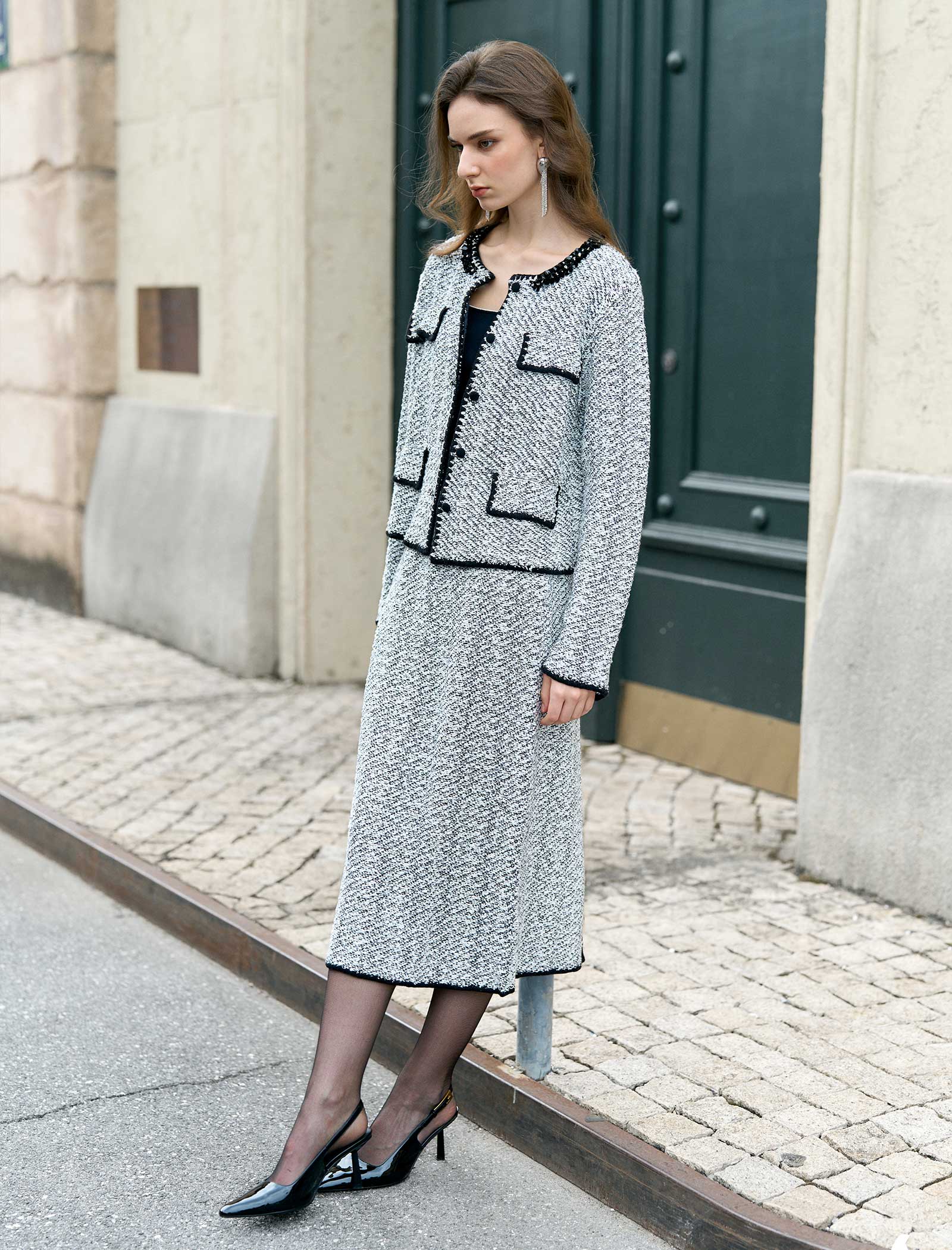 This chic heathered wool-blend midi skirt features a textured fabric and sleek tailored fit, finished with subtle black trim for polish. The knee-length silhouette and back slit add easy movement—pair it with blazers, sweaters, or blouses for work, brunch, or semi-formal outings. It’s a versatile, cozy staple that blends classic style with all-day comfort!