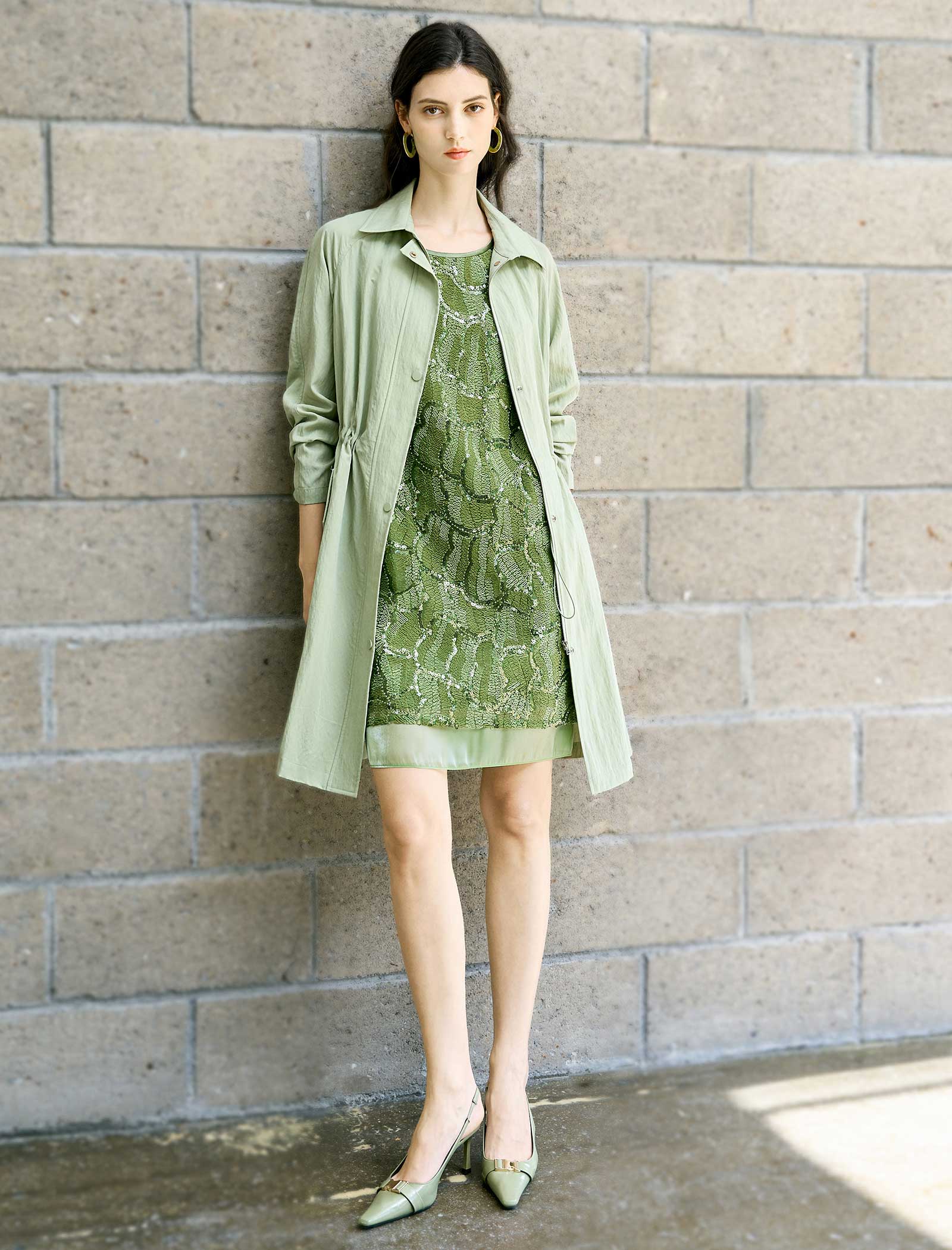 This lightweight trench coat is crafted from a breathable lyocell-blend fabric in a soft sage green hue, offering a smooth, textured feel with a subtle drape. It features a classic point collar, a full-zip front with snap-button overlay, and functional side pockets. The adjustable drawstring waist lets you customize the fit, while raglan sleeves and a midi length create a relaxed, modern silhouette.
