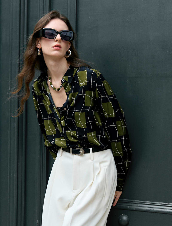 100% Mulberry Silk Green Grid Print Button-Down Shirt
