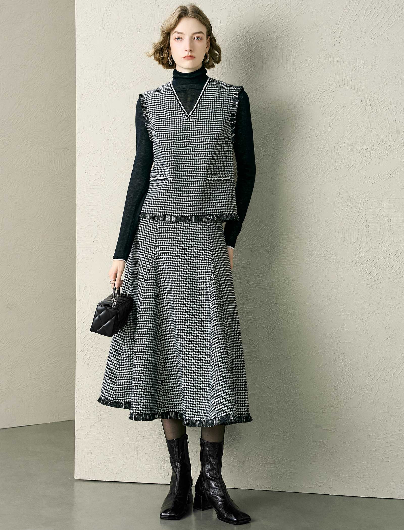 Stay chic and classic with this houndstooth wool-blend midi skirt. It features a flared silhouette and fringed hem, adding a trendy touch. Perfect for pairing with a matching vest or a cozy sweater, it’s a stylish choice for work or dressy occasions.