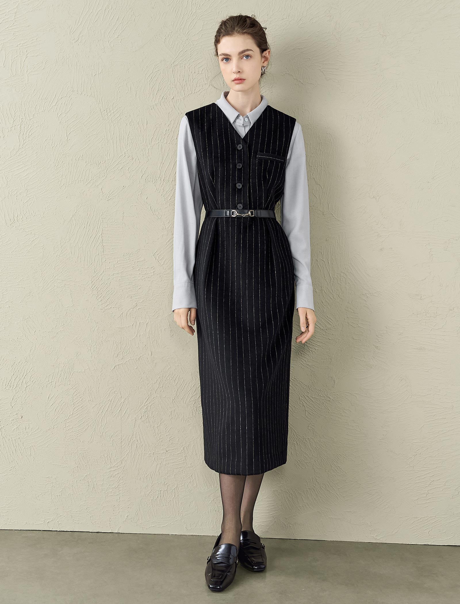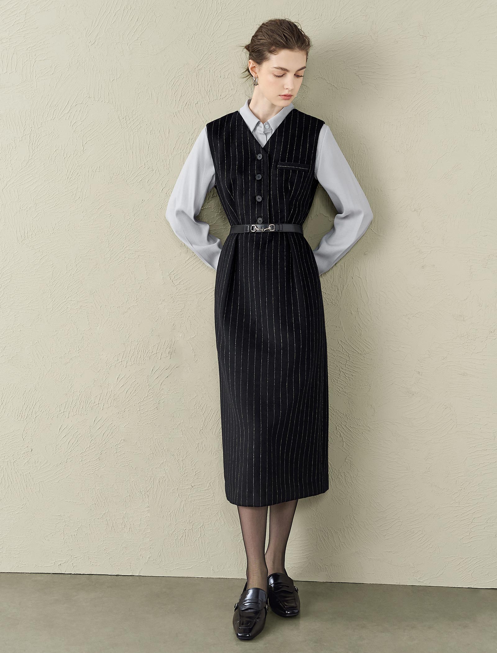 Elevate your work or dressy look with this black pinstripe sleeveless midi dress! It features a classic pinstripe pattern, a V-neck with button front, and a belt to cinch the waist for a flattering fit. The midi length and tailored design make it perfect for pairing with blouses or turtlenecks—ideal for the office, dinners, or special events.