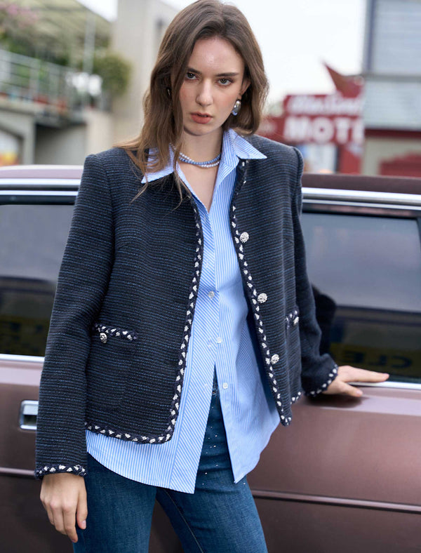 Elevate your style with this navy blue tweed jacket! It features a classic tweed texture, a round neckline, and cute contrast stitching along the edges. The silver-toned buttons add a touch of sparkle. Perfect for pairing with a matching skirt, jeans, or dresses, great for work, events, or any time you want to look polished and chic.
