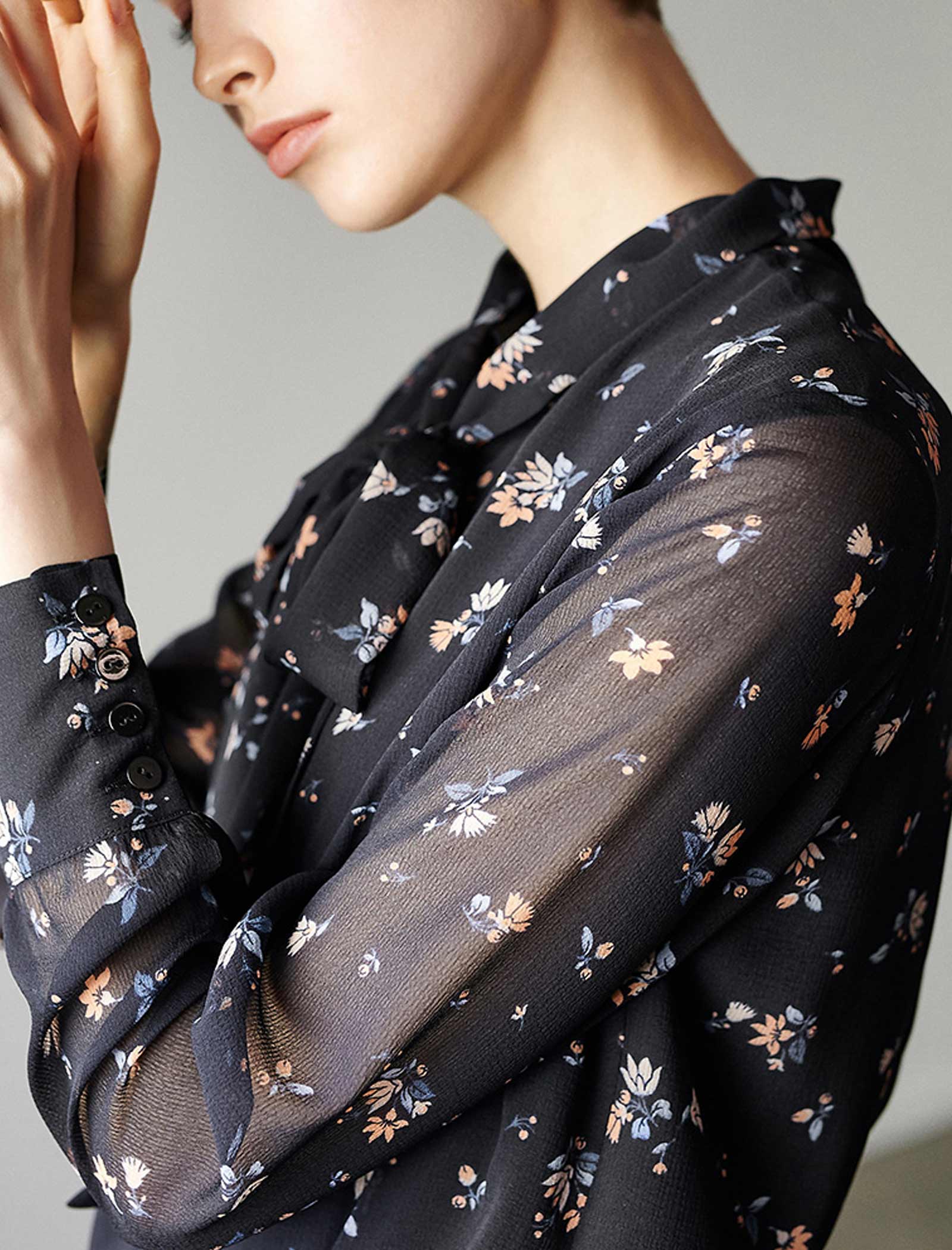 Black Floral Tie Neck Blouse