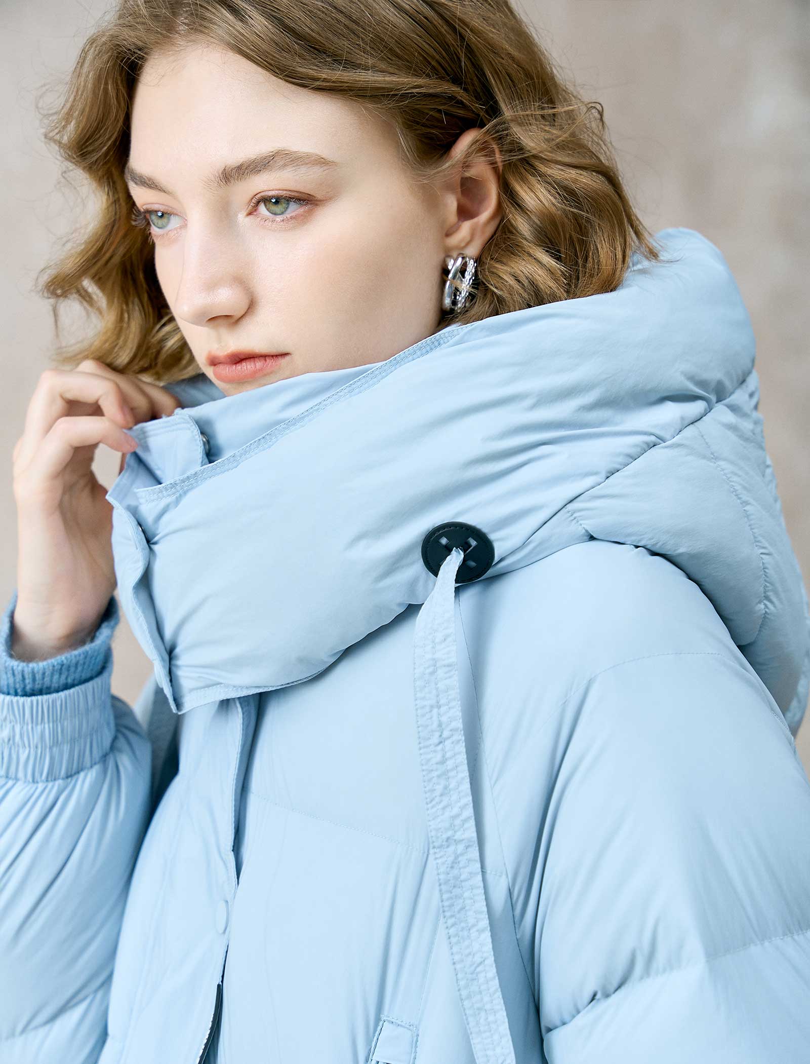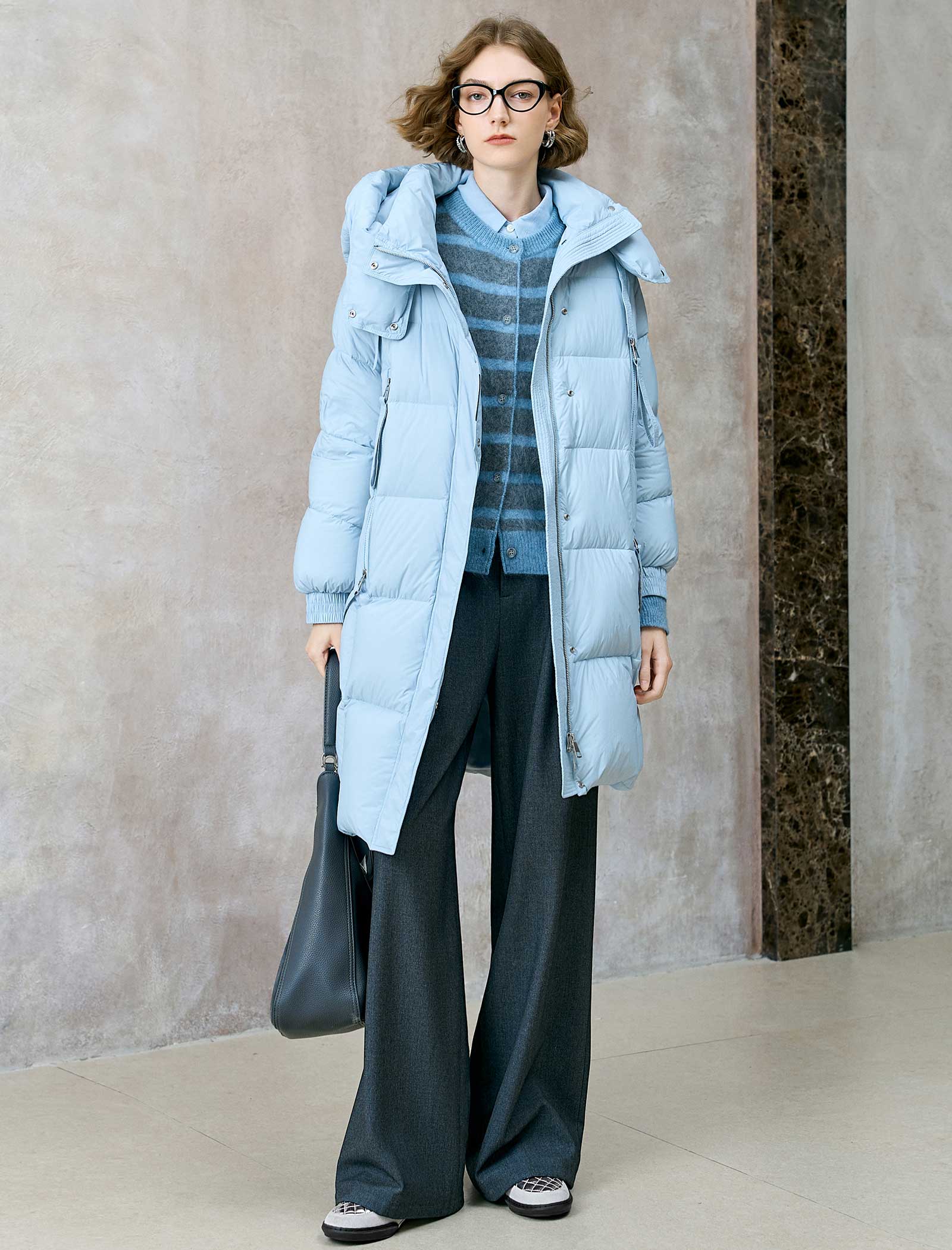 Filled with 90% premium white duck down, this long puffer jacket delivers superior warmth without bulk. It features a cozy hood, functional pockets, and a sleek design. The fabric is smooth and durable, perfect for layering over sweaters or tops on cold days. Stay stylish and warm all winter long.