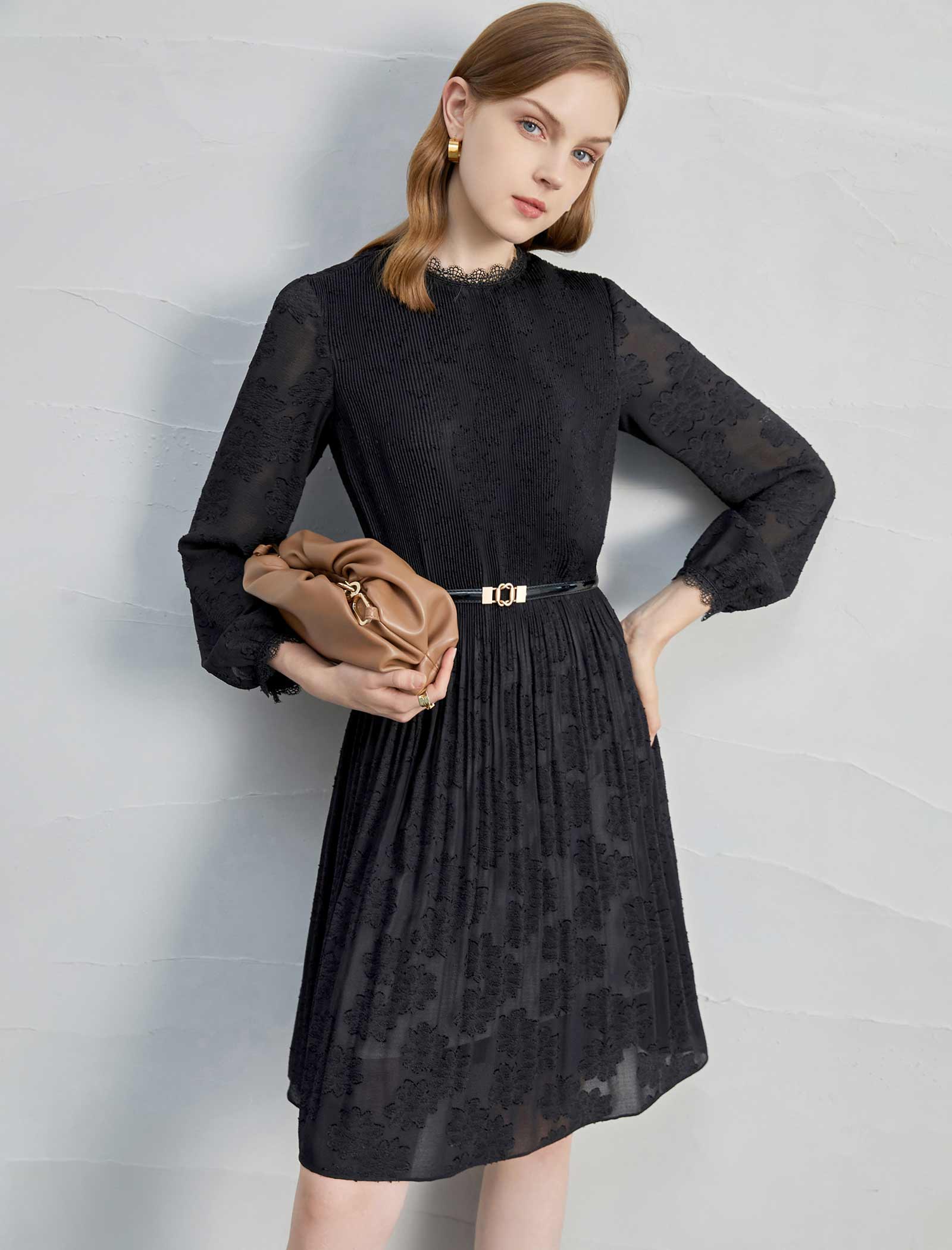 Black Lace Pleated Midi Dress