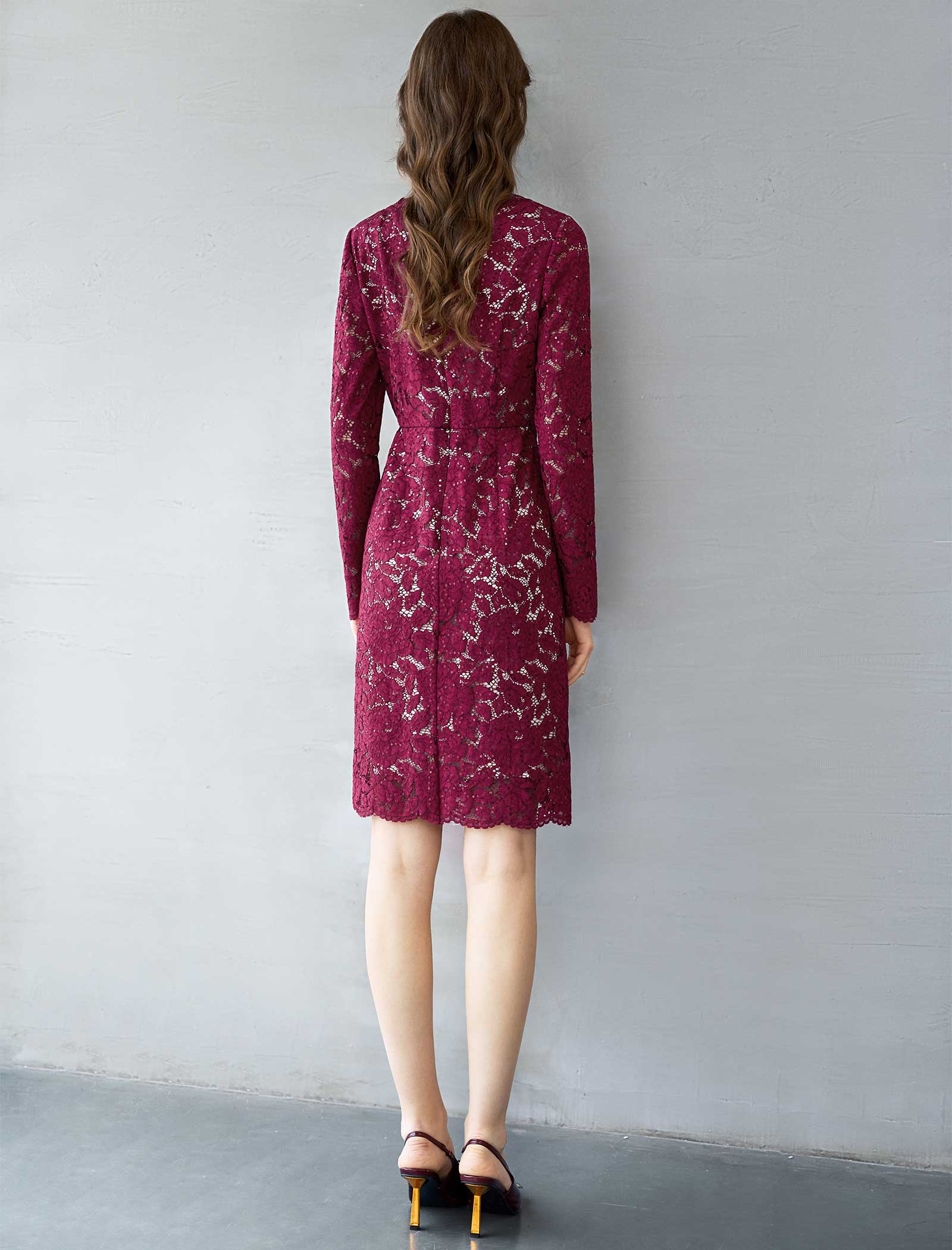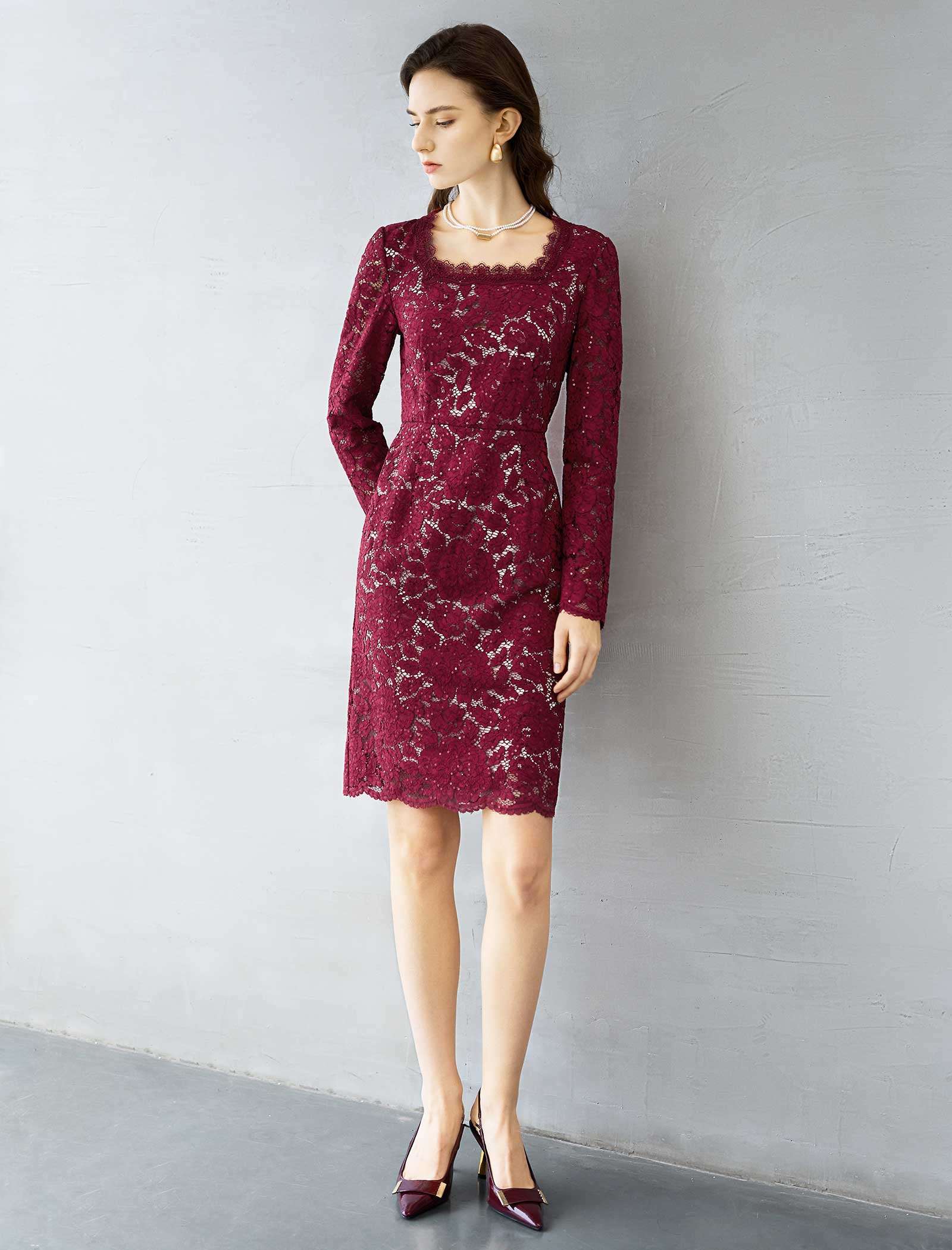 This elegant sheath dress is crafted from intricate burgundy lace woven with subtle sequins that catch the light for a gentle, luxurious shimmer. It features a romantic square neckline with scalloped lace trim, long sleeves, and a tailored silhouette that skims your figure for a flattering fit. The scalloped hem adds a feminine finishing touch.