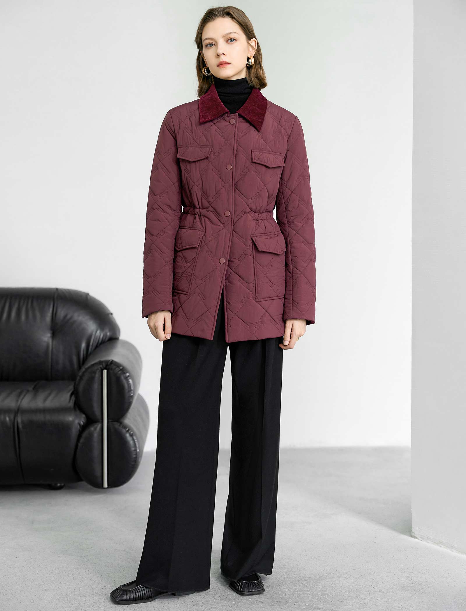 Stay warm and stylish with this burgundy quilted jacket. It features a velvet collar for a touch of elegance, a button-front closure, and a drawstring waist for a customizable fit. The quilted design and multiple pockets add both style and practicality. Perfect for cooler days, this jacket is a chic choice whether you’re going to work or running errands.