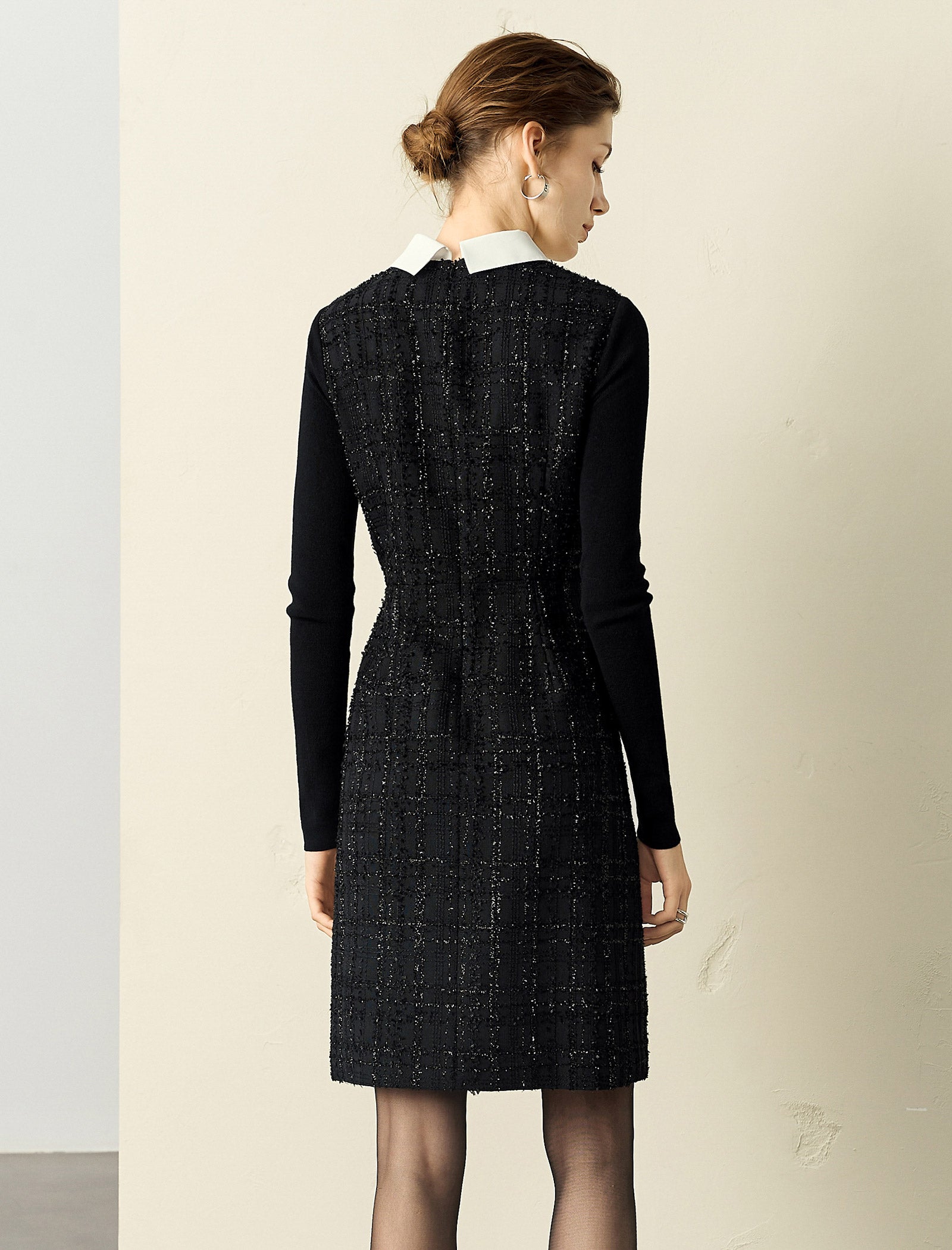 2. Contrasting white collar and knit sleeves for a modern, textured look.
