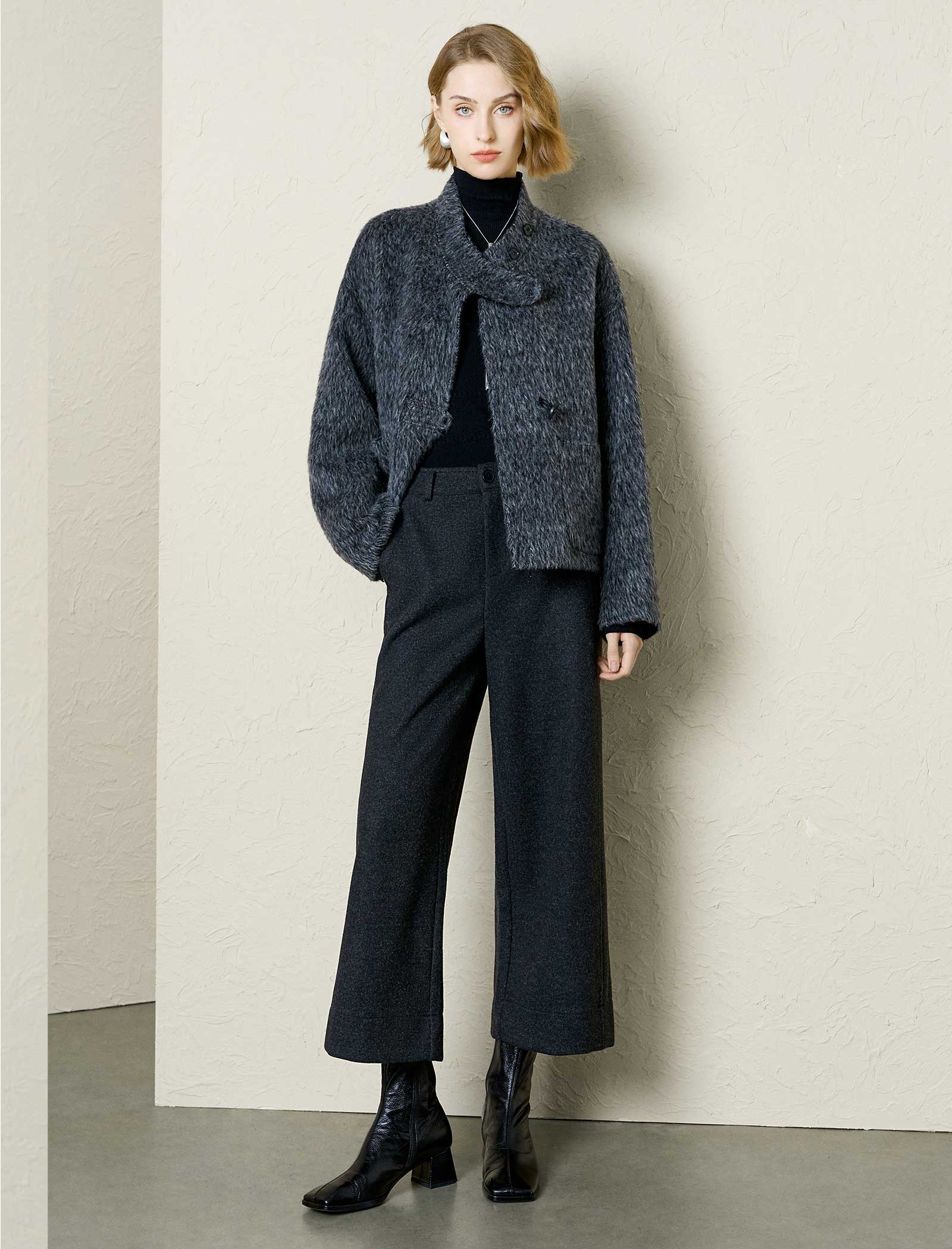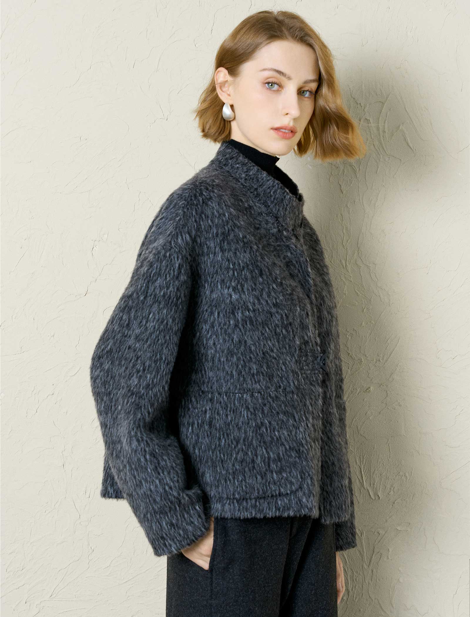 Stay cozy and stylish with this wool-alpaca blend fuzzy cropped jacket. It features a stand collar, unique button details, and a soft, textured fabric. The cropped fit adds a trendy touch, while the warm material keeps you comfortable on chilly days. Pair it with trousers or jeans for a chic, casual look. Available in gray, this jacket is a must-have for cold-weather fashion.
