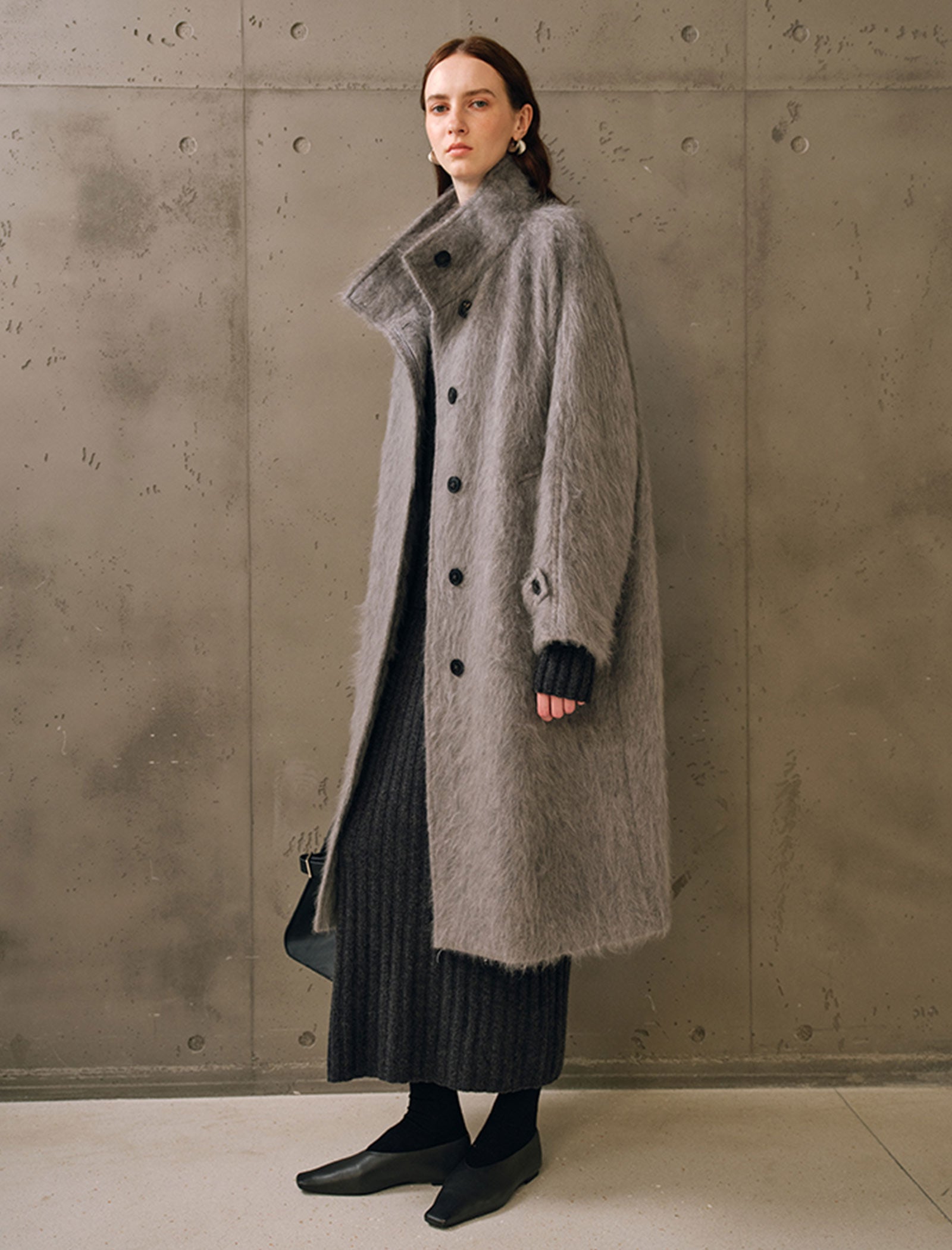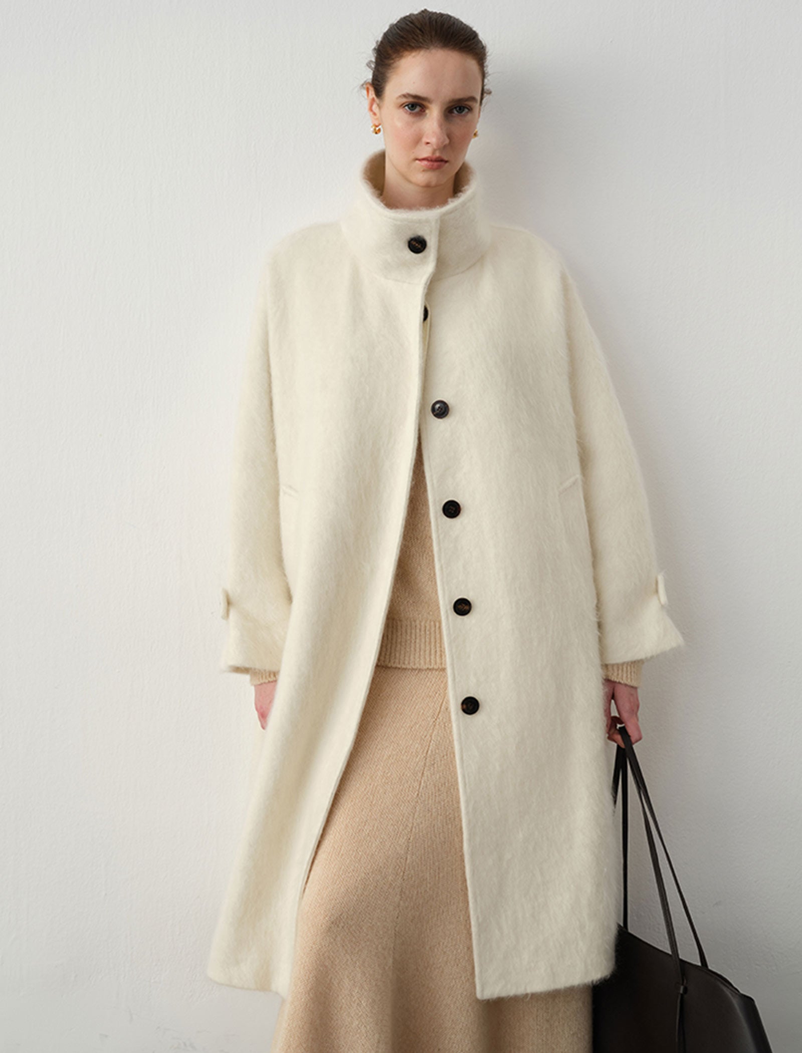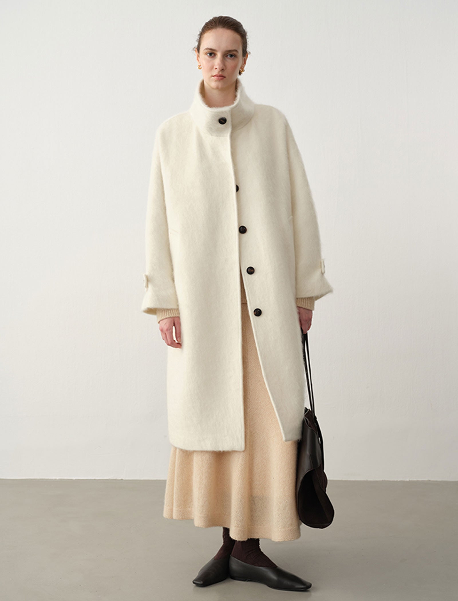 Wool-Cashmere Silk Blend Stand Collar Fuzzy Long Coat