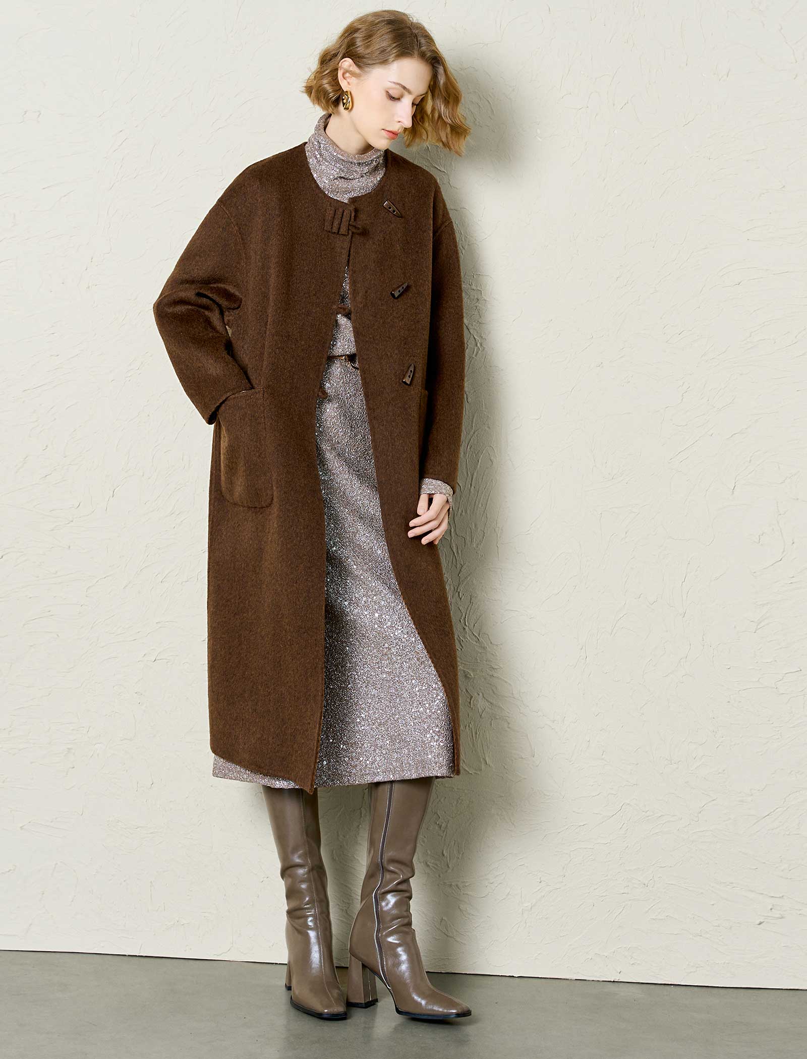 Wool-Tencel Blend Removable Knit Hooded Scarf Long Coat