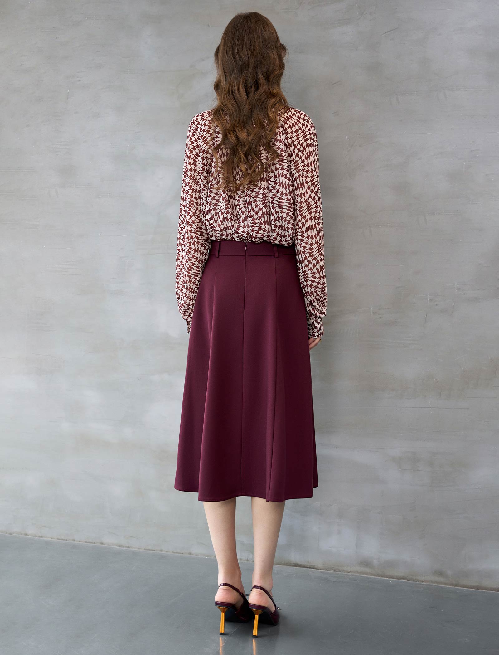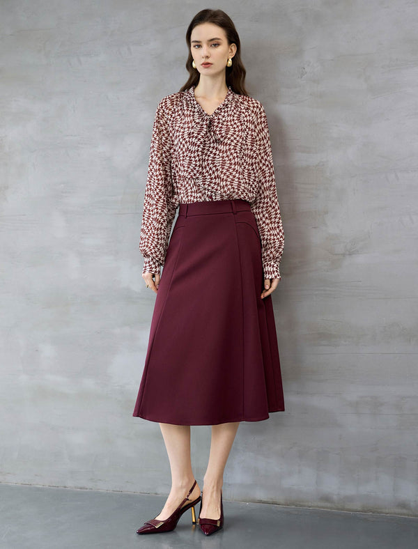This polished midi skirt is crafted from a structured, wrinkle-resistant fabric in a rich burgundy hue. It features a high-rise waist and a classic A-line silhouette that flares gently from the hips for a flattering, feminine fit.