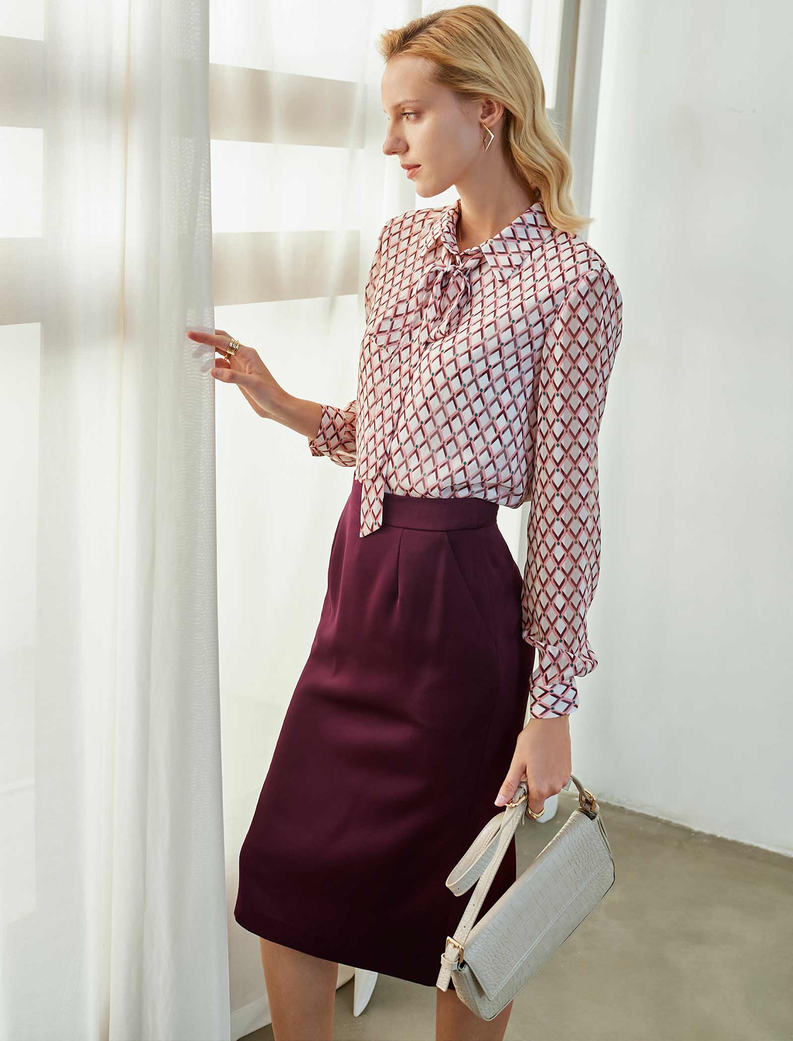 This playful blouse blends bold pattern with polished charm. Its pink-and-white geometric grid print feels vibrant, while the front tie-neck detail adds a feminine, adjustable touch. The lightweight, sheer fabric and long sleeves keep it comfortable—tuck into a deep burgundy skirt for the office, or pair with jeans for a casual yet put-together look. It’s a versatile piece that balances whimsy and sophistication.