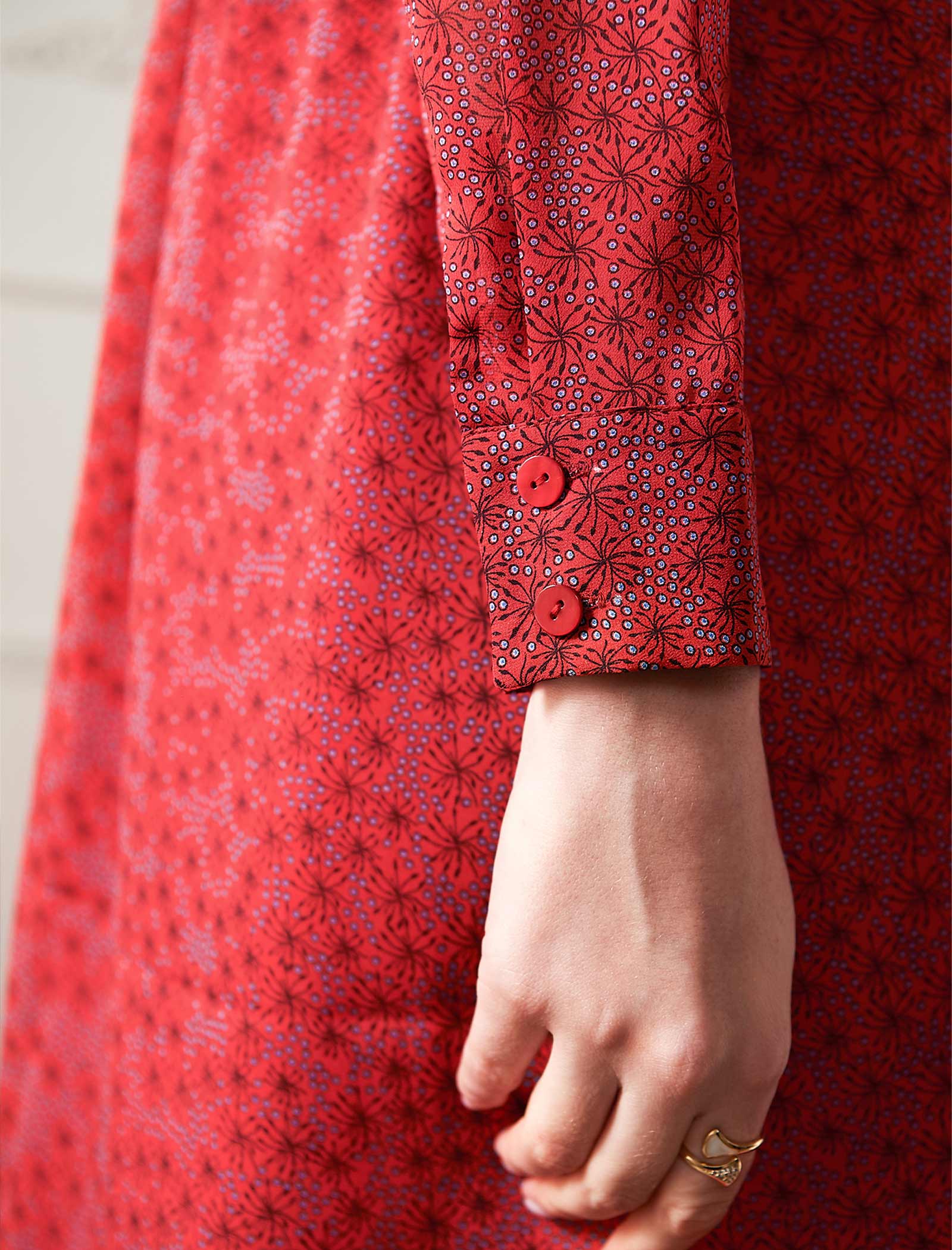 Red Ditsy Print Long Sleeve Midi Dress