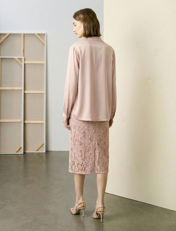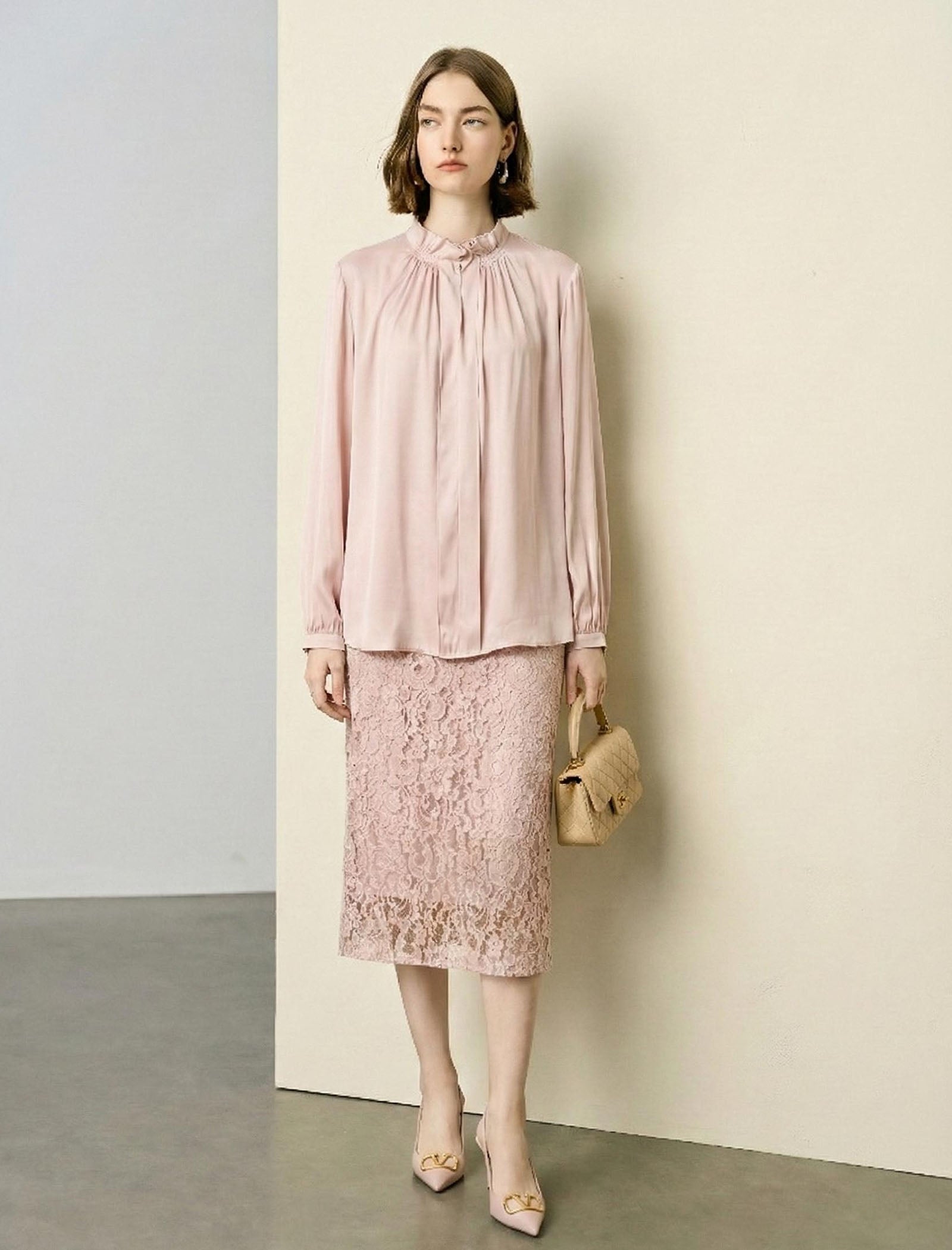 This soft blush blouse is crafted from smooth satin fabric, featuring a subtle front pleats for a polished, feminine look. Its long, gently gathered sleeves add a touch of charm, while the lightweight material feels breezy. Tuck it into a matching lace skirt for a brunch date, or pair with high-waisted jeans for a casual-chic vibe. It’s a versatile, elegant staple that balances comfort and sophistication.