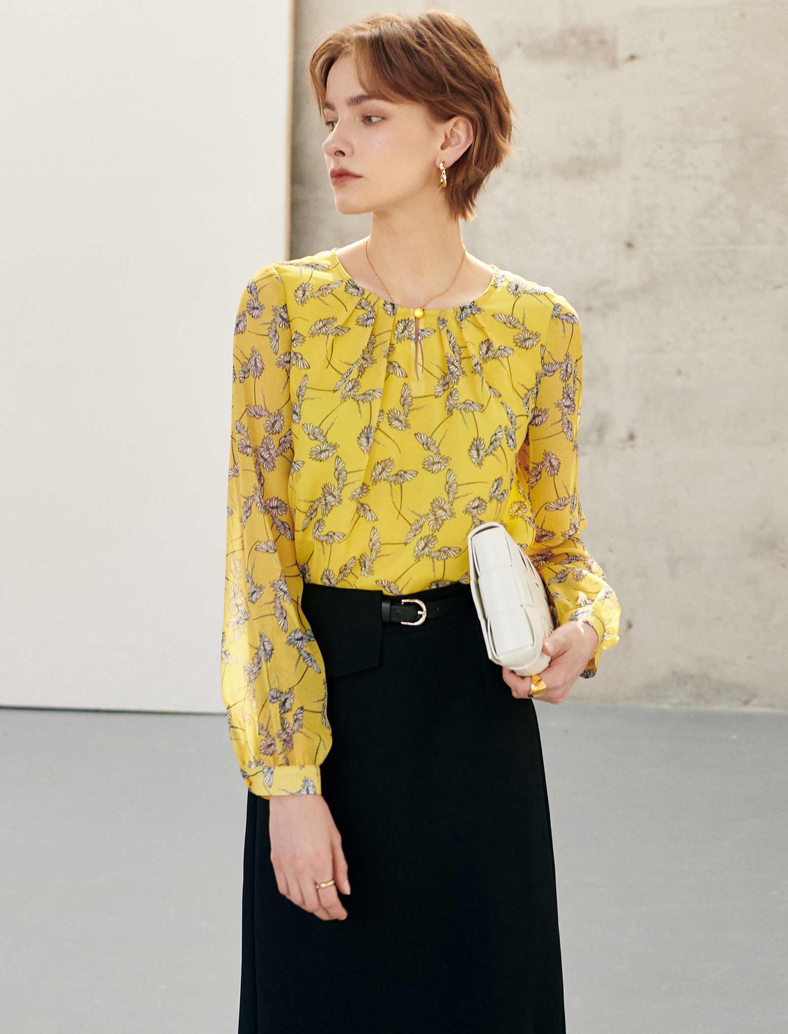 This vibrant sunflower yellow blouse features a delicate botanical print, a subtle keyhole neckline with a button detail, and billowy long sleeves for a fresh, feminine vibe. Crafted from lightweight, semi-sheer fabric, it feels soft and breezy, making it perfect for pairing with tailored trousers for the office or a sleek midi skirt for brunch. Versatile, eye-catching, and easy to style, it’s a lively addition to your everyday wardrobe.