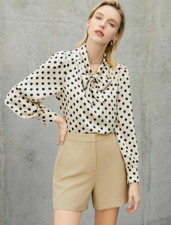 This cream polka dot blouse mixes retro charm with modern polish: its bold black dots feel timeless, while the front bow detail and puffy sleeves add feminine flair. The smooth, lightweight fabric keeps it comfortable—tuck into tan shorts for a weekend look, or pair with tailored pants for the office. Easy to dress up or keep casual, it’s a versatile staple for any wardrobe.