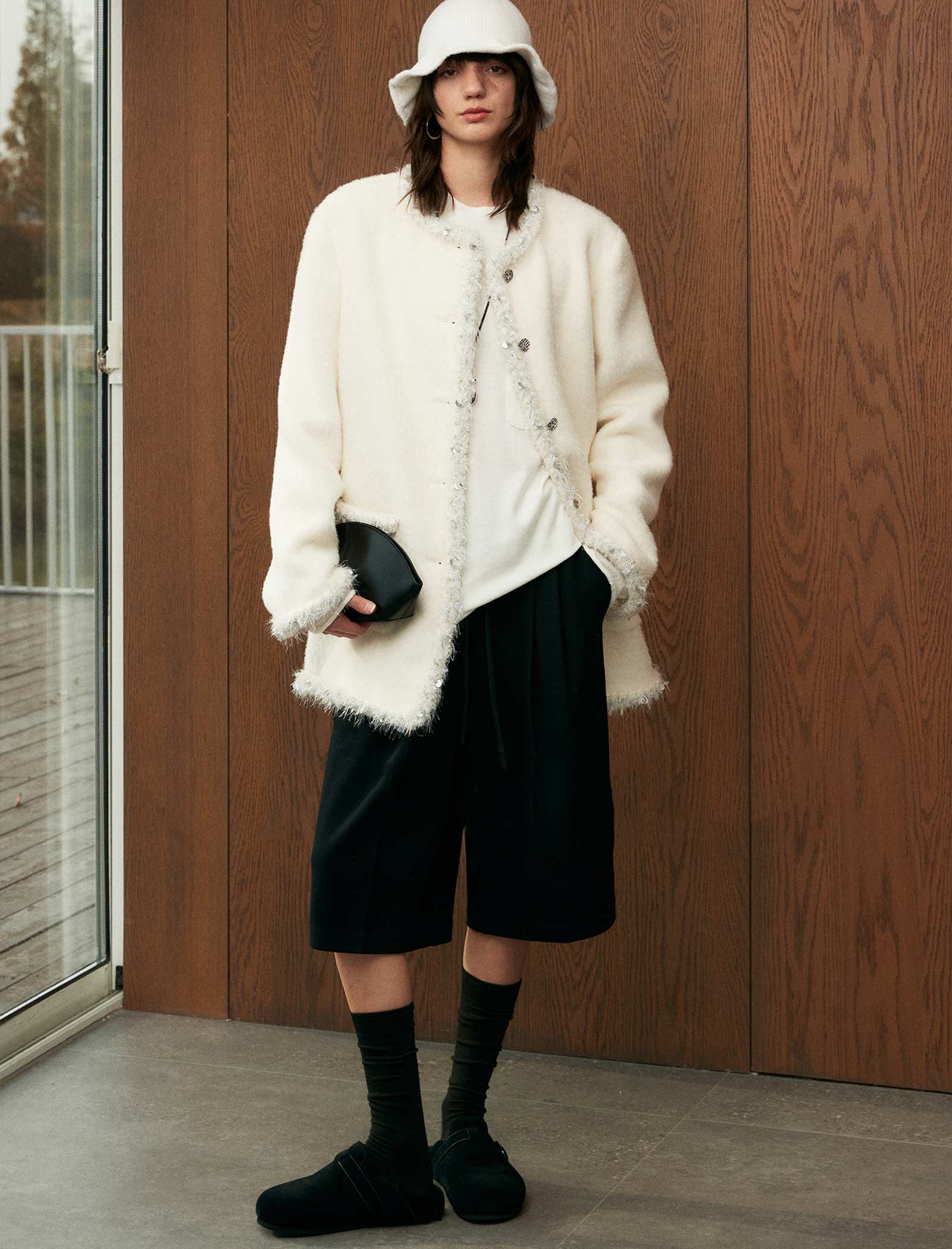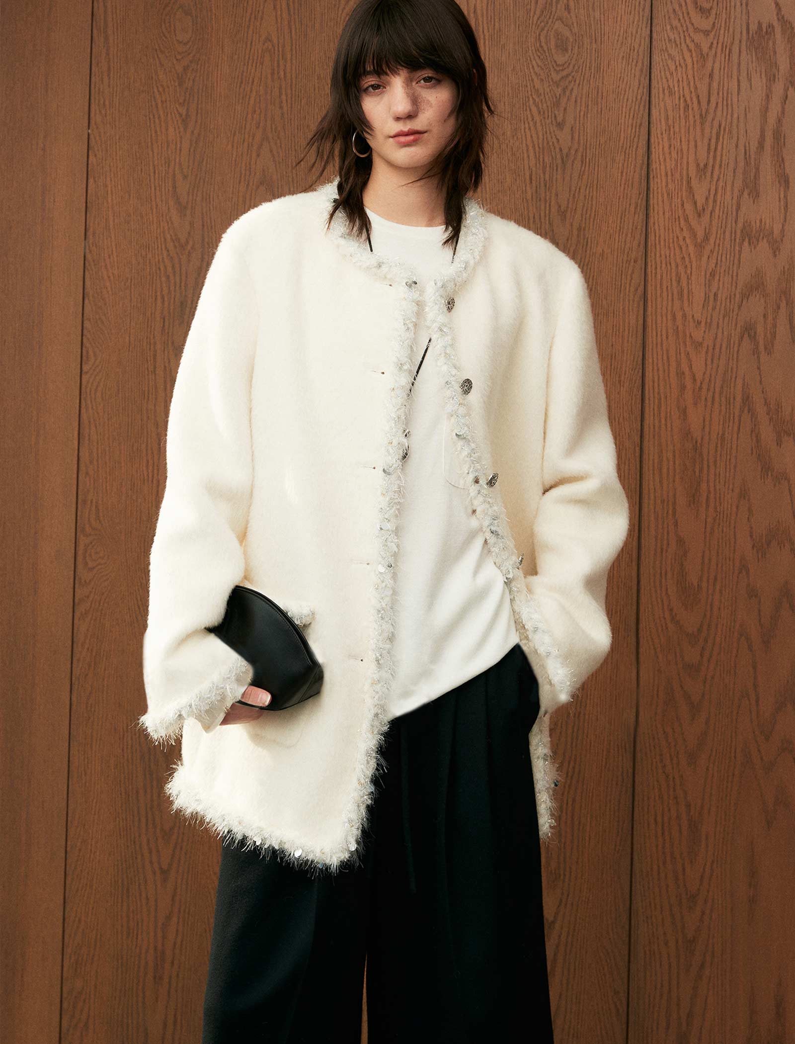 Stay cozy and stylish with this 100% alpaca coat. It features a soft, fuzzy texture, chic tweed trim, and a relaxed fit. The unique button details and roomy pockets add a trendy touch. Available in gray and cream, this coat pairs easily with jeans, skirts, or trousers for a chic cold-weather look.