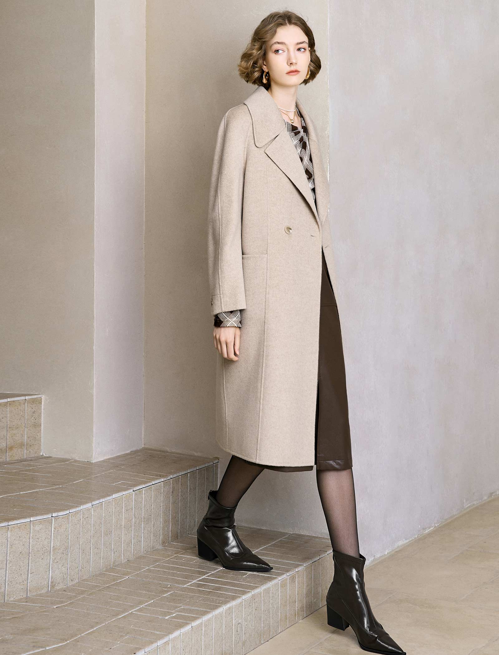 Stay cozy and timeless with this 100% wool double-breasted maxi coat. It features a classic lapel collar, polished buttons, and a soft, warm texture. The long, relaxed fit pairs easily with dresses, trousers, or jeans. Available in beige, this coat is a chic and warm choice for cold days.