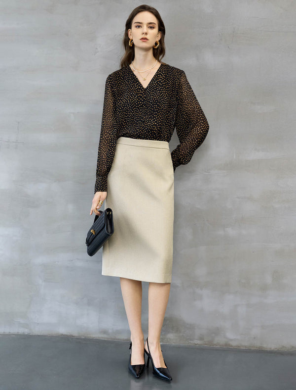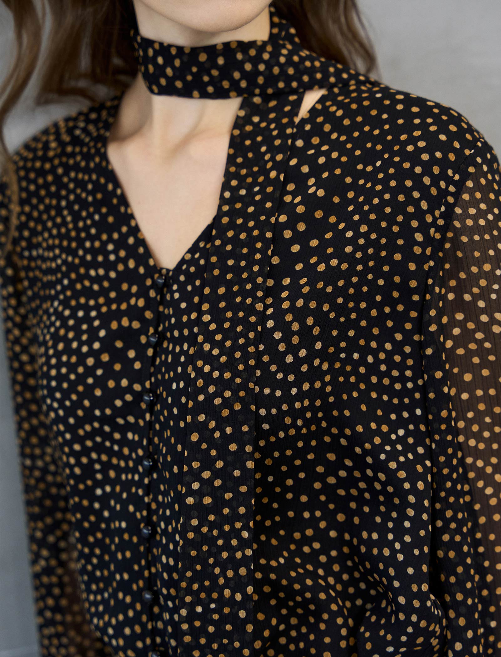 This chic black blouse features a playful gold dot print, a V-neckline with a detachable self-tie neck scarf, and billowy semi-sheer long sleeves for a romantic, polished look.