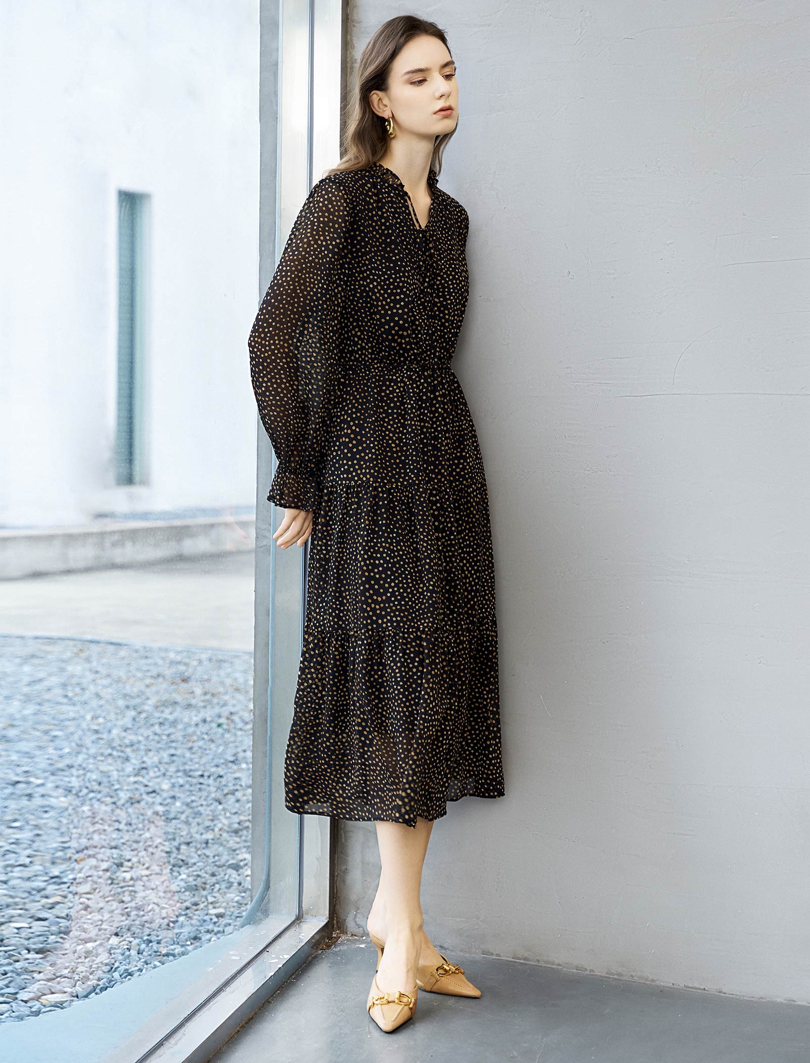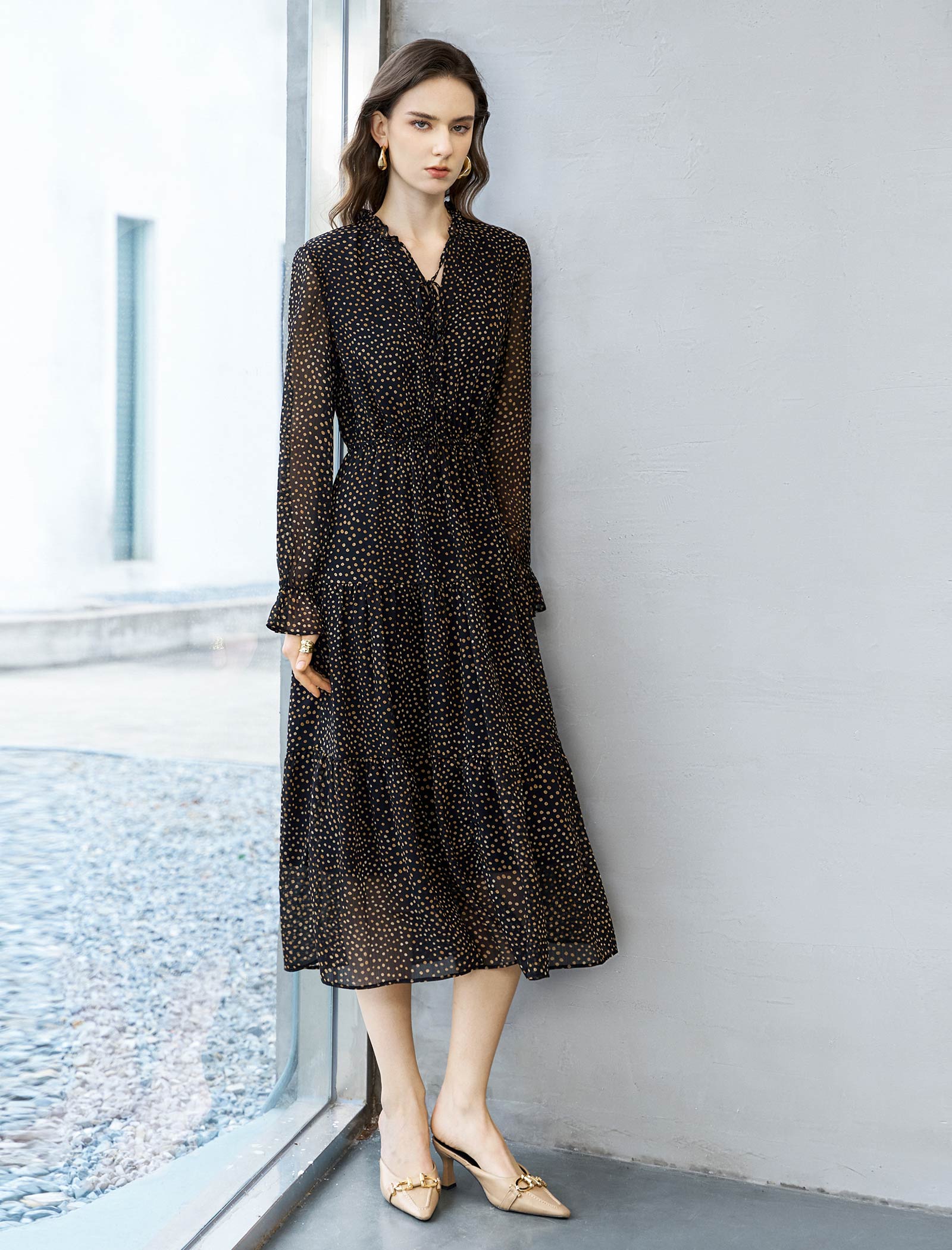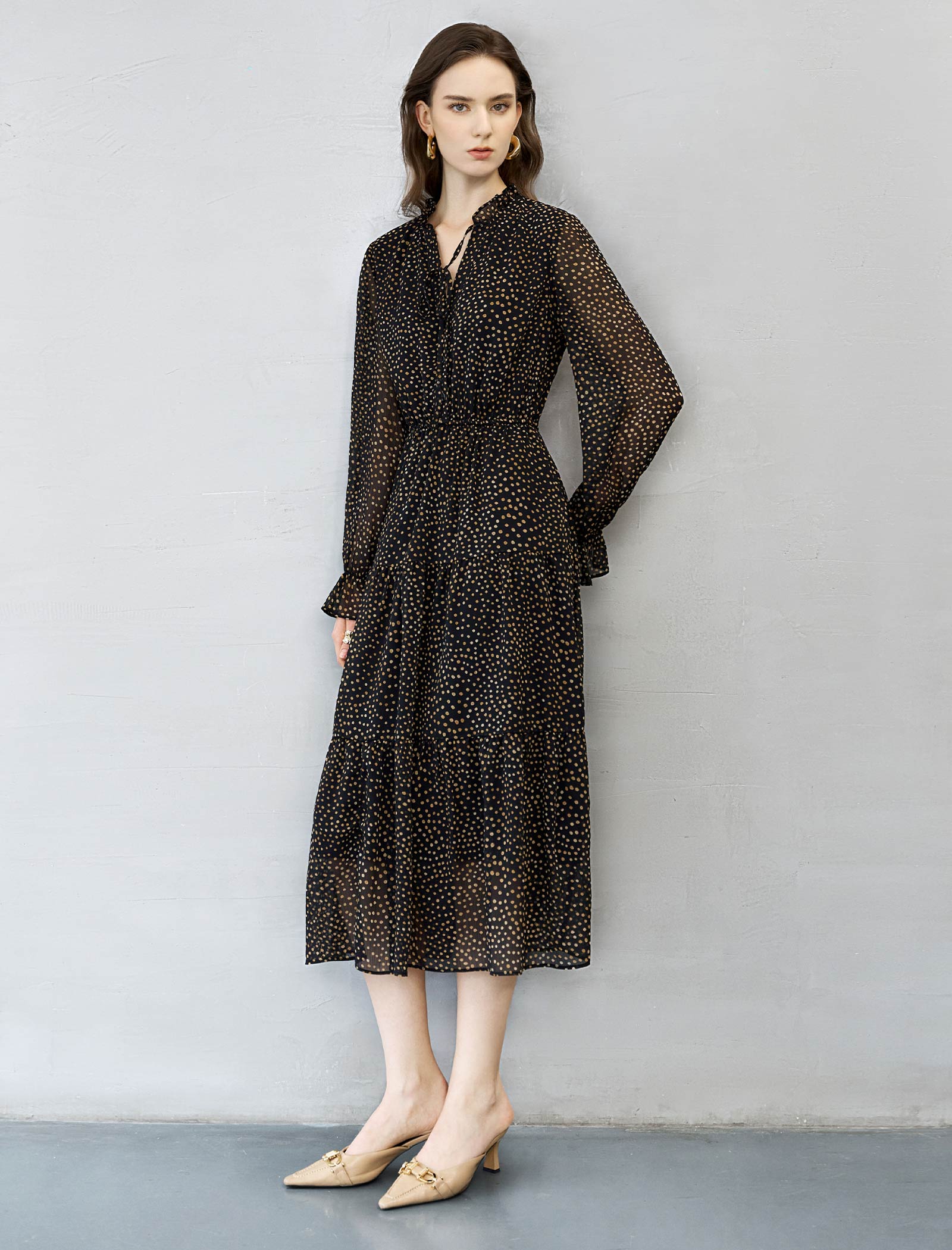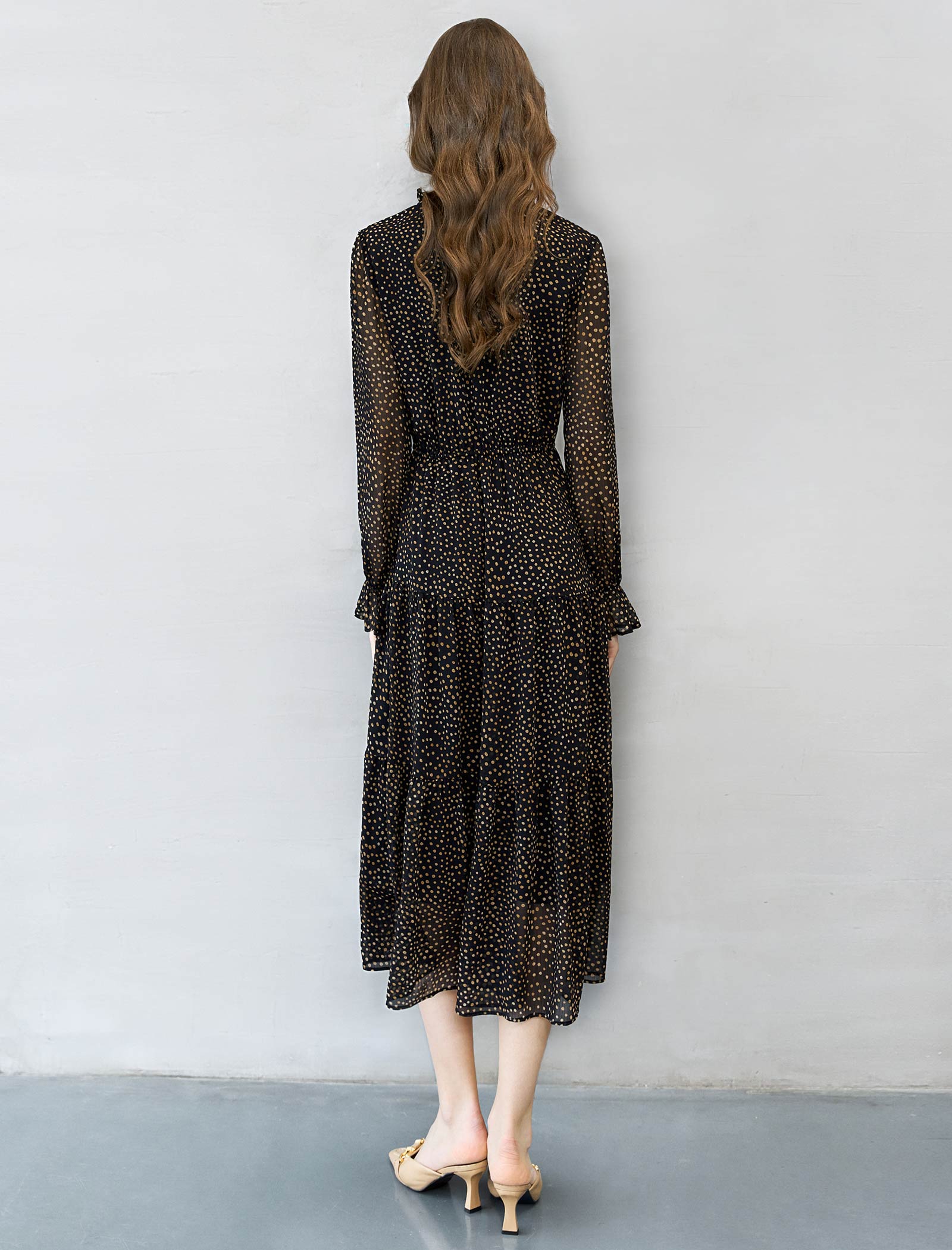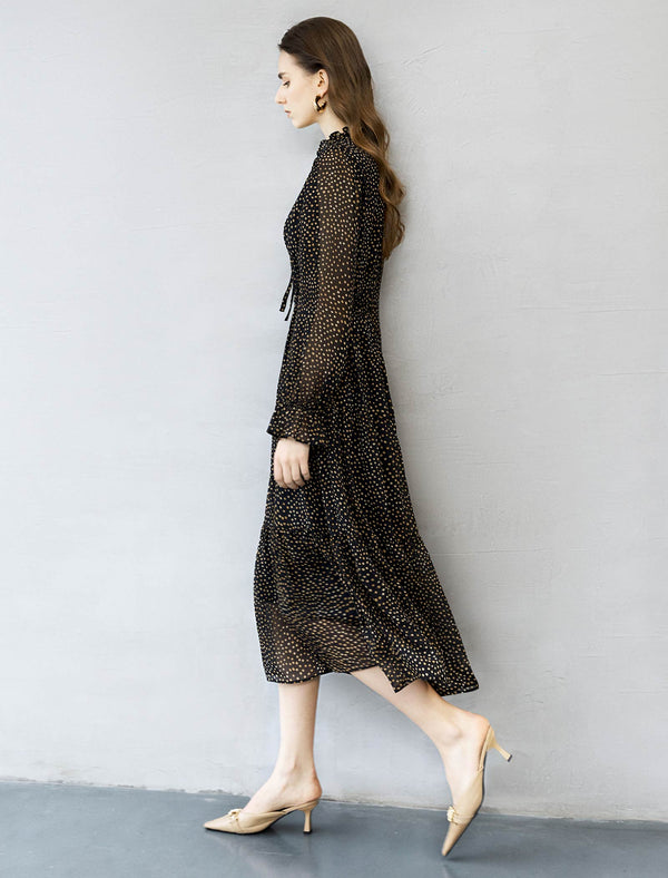 This elegant black midi dress features a playful gold dot print, a ruffled V-neckline with a self-tie scarf, and semi-sheer billowy long sleeves for a romantic, polished look. The tiered skirt adds beautiful movement, while the elastic waist flatters your shape.