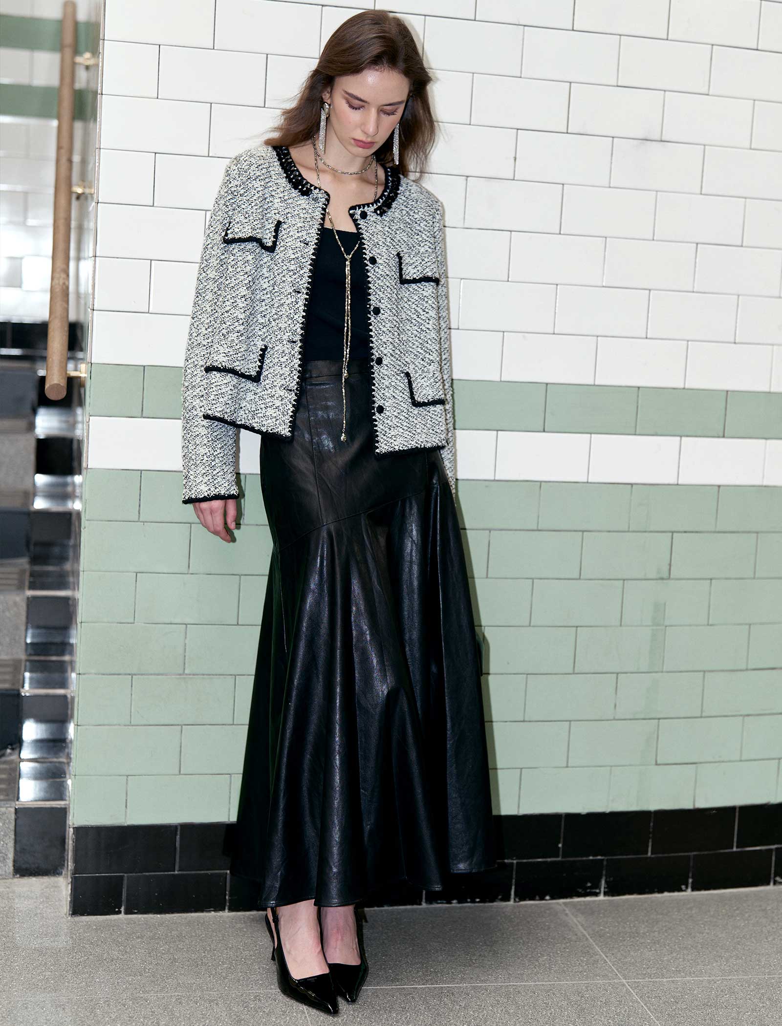 This sleek black faux leather maxi skirt features a flowy, A-line silhouette that moves beautifully. The soft, structured fabric adds edge and elegance—pair it with blouses, sweaters, or jackets for dates, brunch, or nights out. It’s a versatile staple that blends bold style with easy wear!