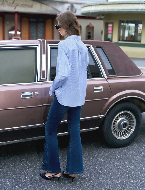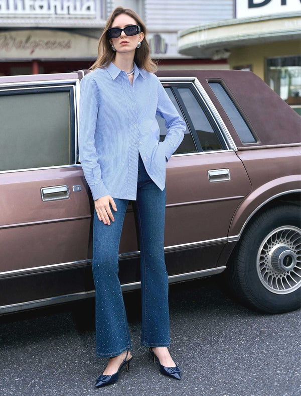 Step into effortless, classic style with this light blue striped button-down shirt: its crisp, breathable fabric feels comfy yet polished, with a relaxed fit that works for any casual occasion. Wear it tucked into jeans, left loose with skirts, or layered under blazers—perfect for brunch, errands, or low-key work days. This versatile staple adds a fresh, timeless vibe to your wardrobe!