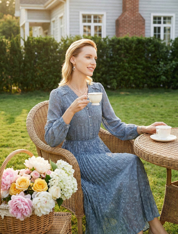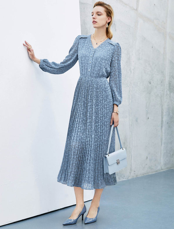 Mist Blue Embossed Leopard Shadow Pleated Dress
