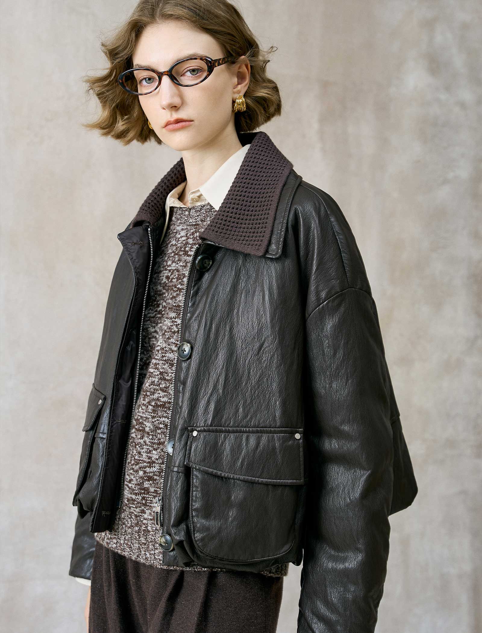 Filled with 90% premium white duck down, this faux leather puffer jacket delivers exceptional warmth without bulk. It features a sleek black faux leather exterior, a cozy knit collar, and functional pockets. The design blends edgy style with winter practicality, making it perfect for layering over sweaters or tees. Stay warm and stylish on cool-weather outings or casual days.