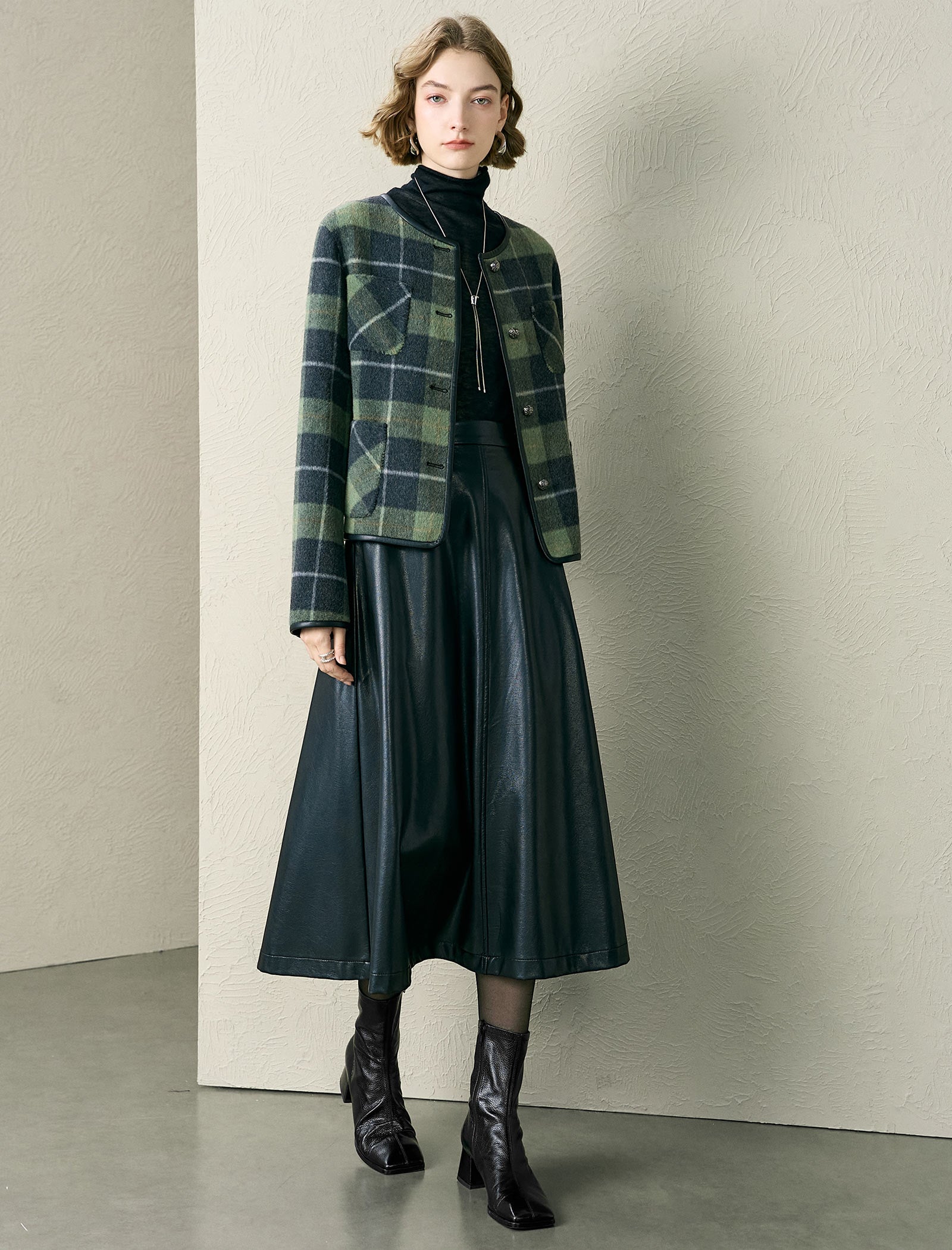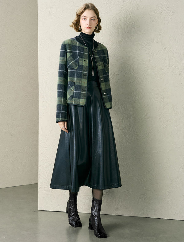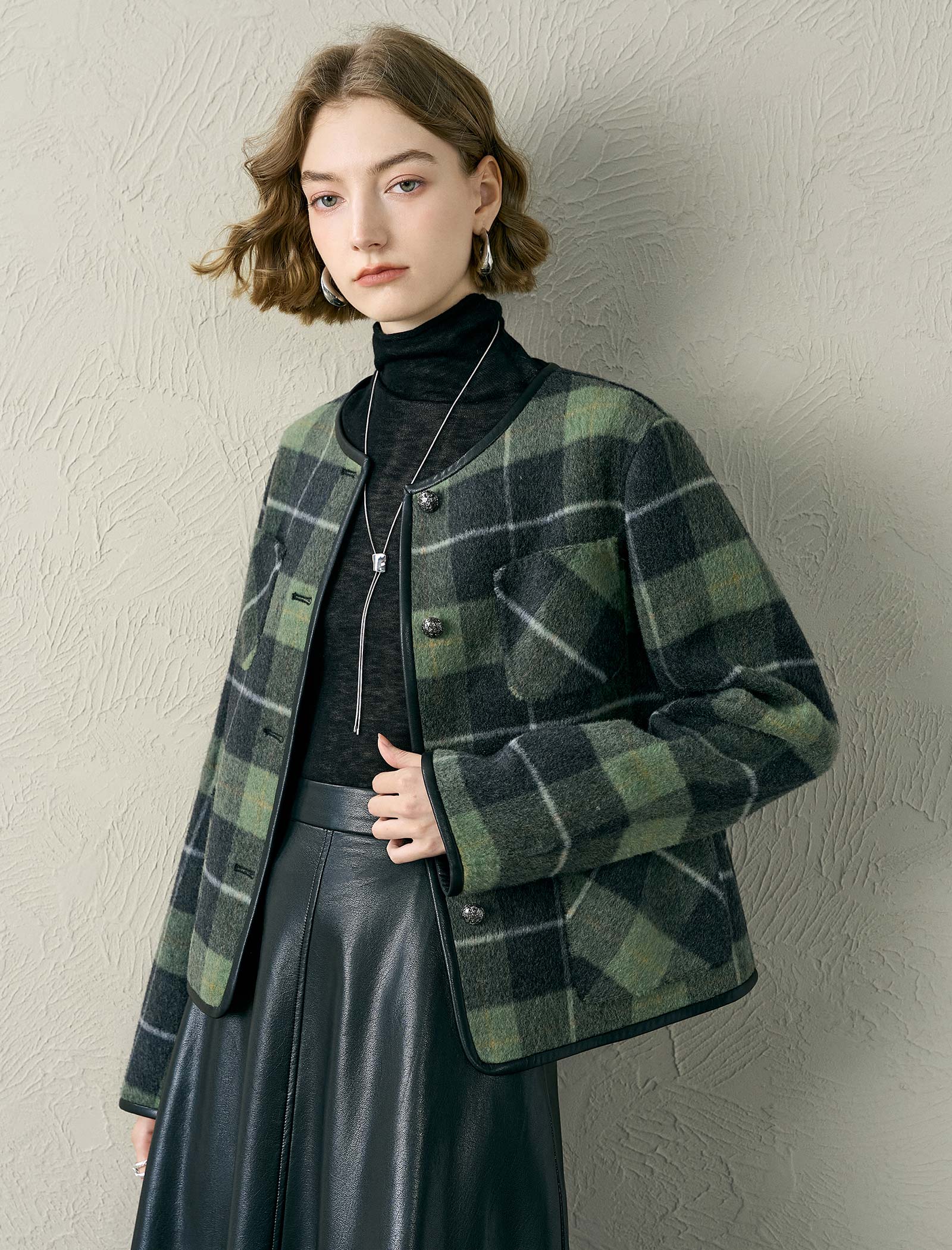 Add a stylish edge to your fall wardrobe with this green plaid wool-blend jacket. It features a classic plaid pattern, black leather trim, and decorative buttons that give it a chic, polished look. The soft wool-blend fabric keeps you warm, and the relaxed fit makes it easy to layer over sweaters or tops. Perfect for pairing with leather skirts or jeans, this jacket is a versatile choice for both casual and dressy occasions.