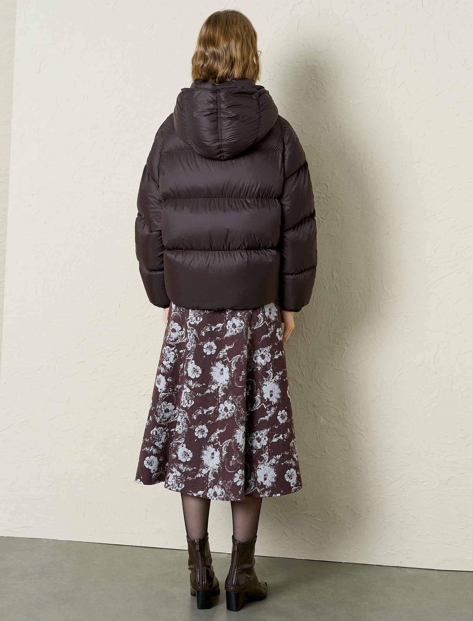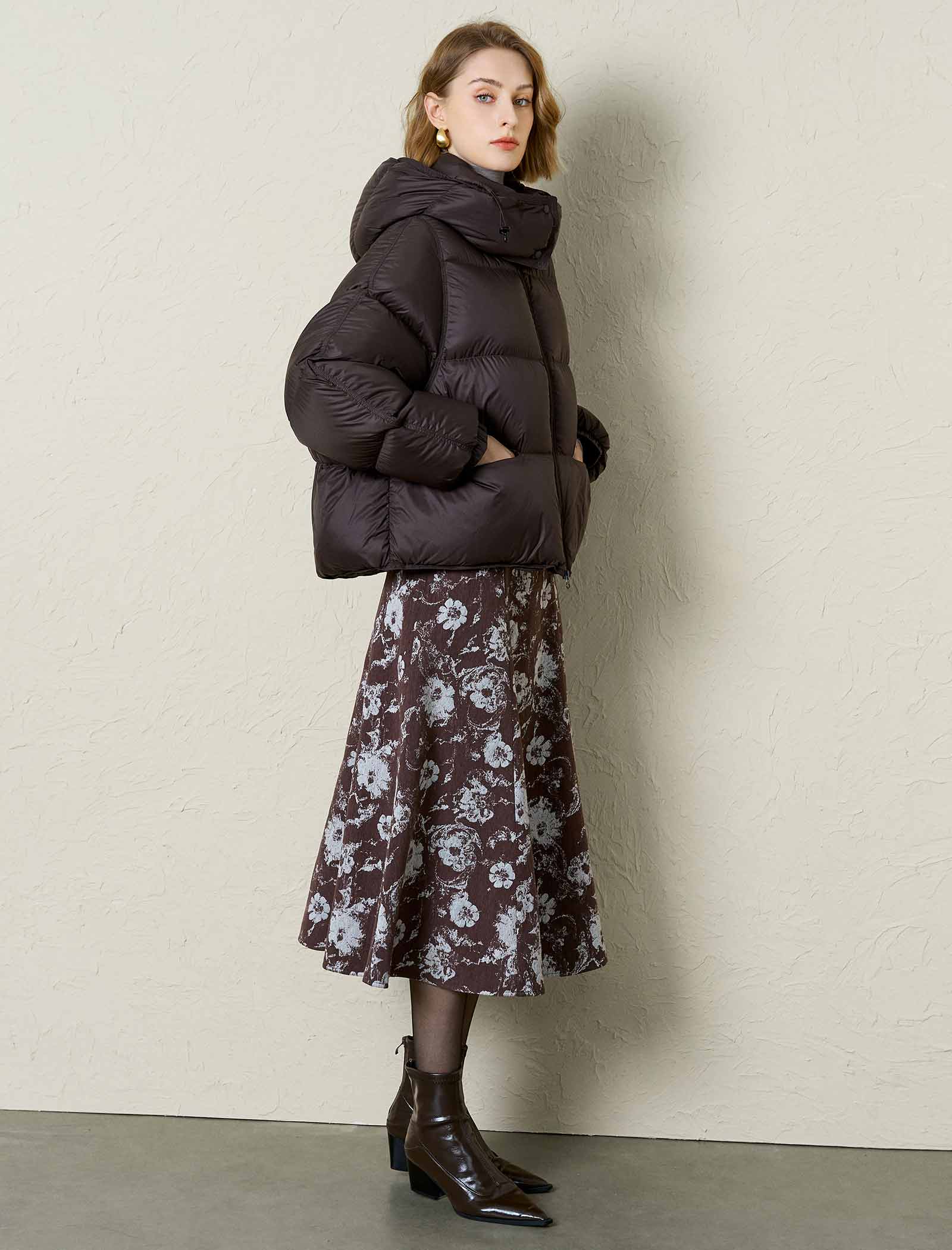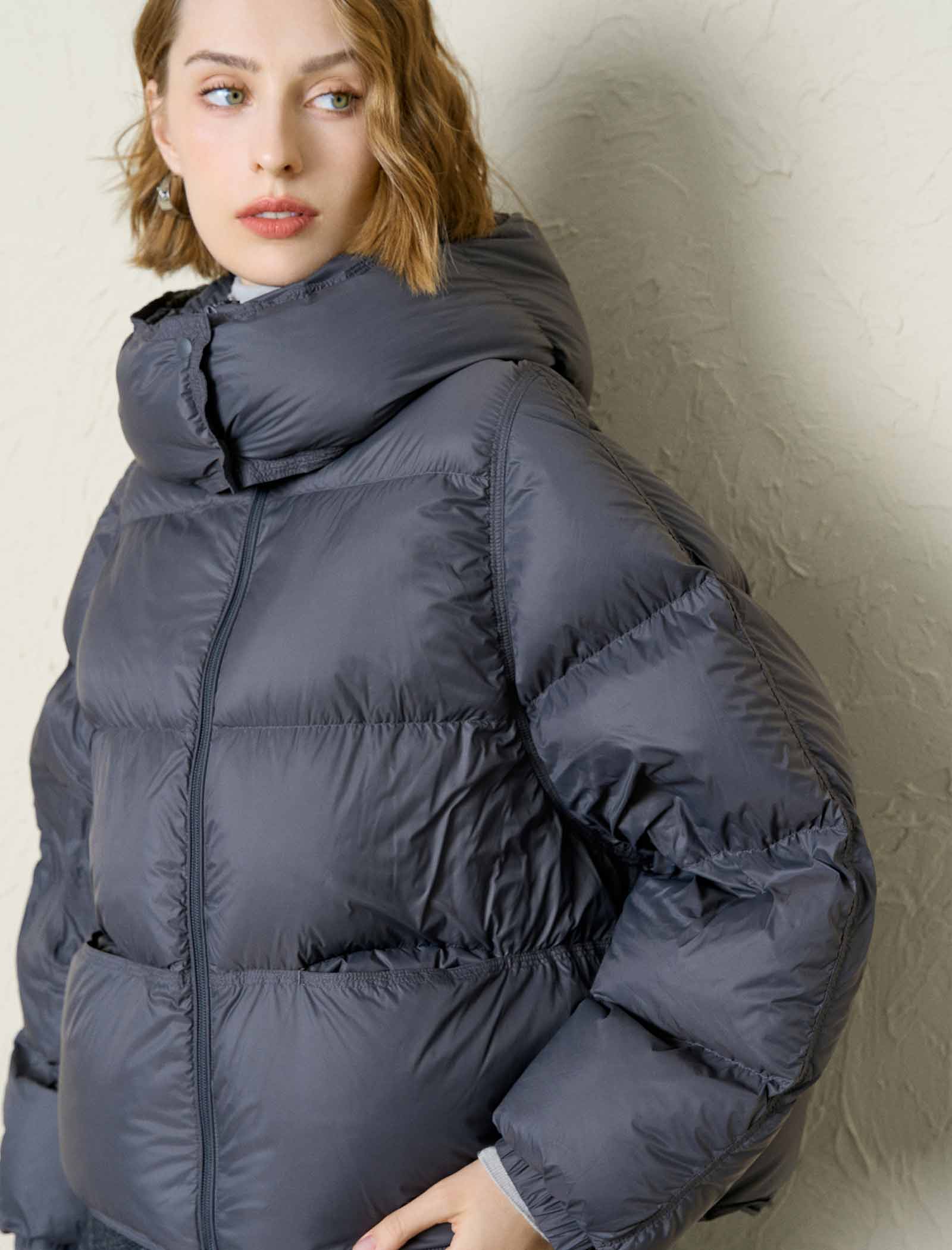 Filled with 95% premium white duck down, this hooded cropped puffer jacket offers superior warmth and a trendy look. It features a cozy hood, a relaxed fit, and a shiny finish. The cropped length pairs perfectly with high-waisted pants or skirts, making it a stylish choice for cold days. Stay cozy and fashionable all winter long.