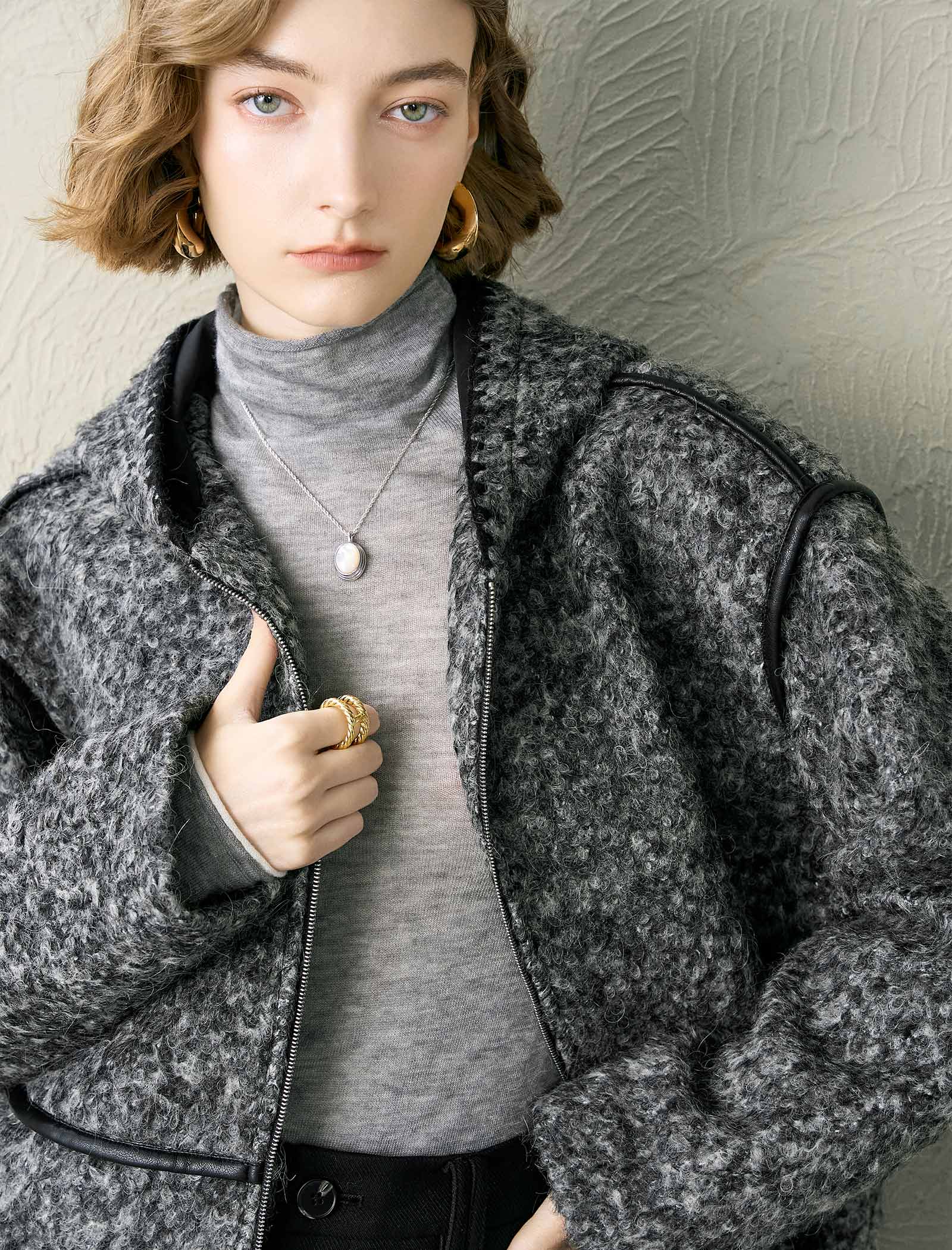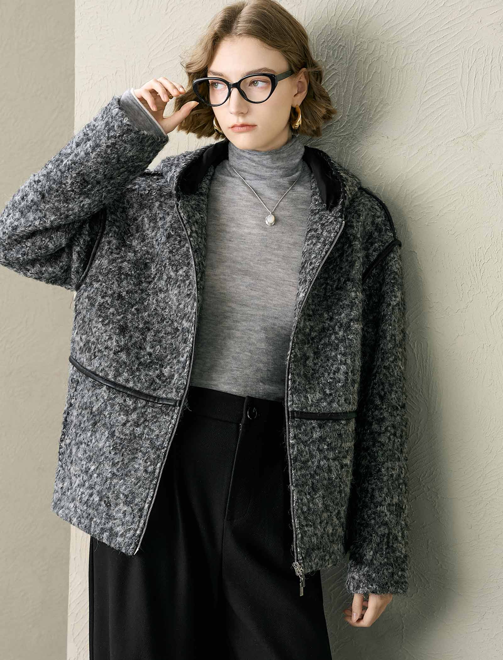Stay cozy and stylish with this hooded tweed wool-blend jacket. It features a zip-up front, leather trim, and a relaxed fit. The soft, warm fabric is perfect for layering over sweaters or tops on cool days. Pair it with trousers or jeans for a trendy, effortless look.