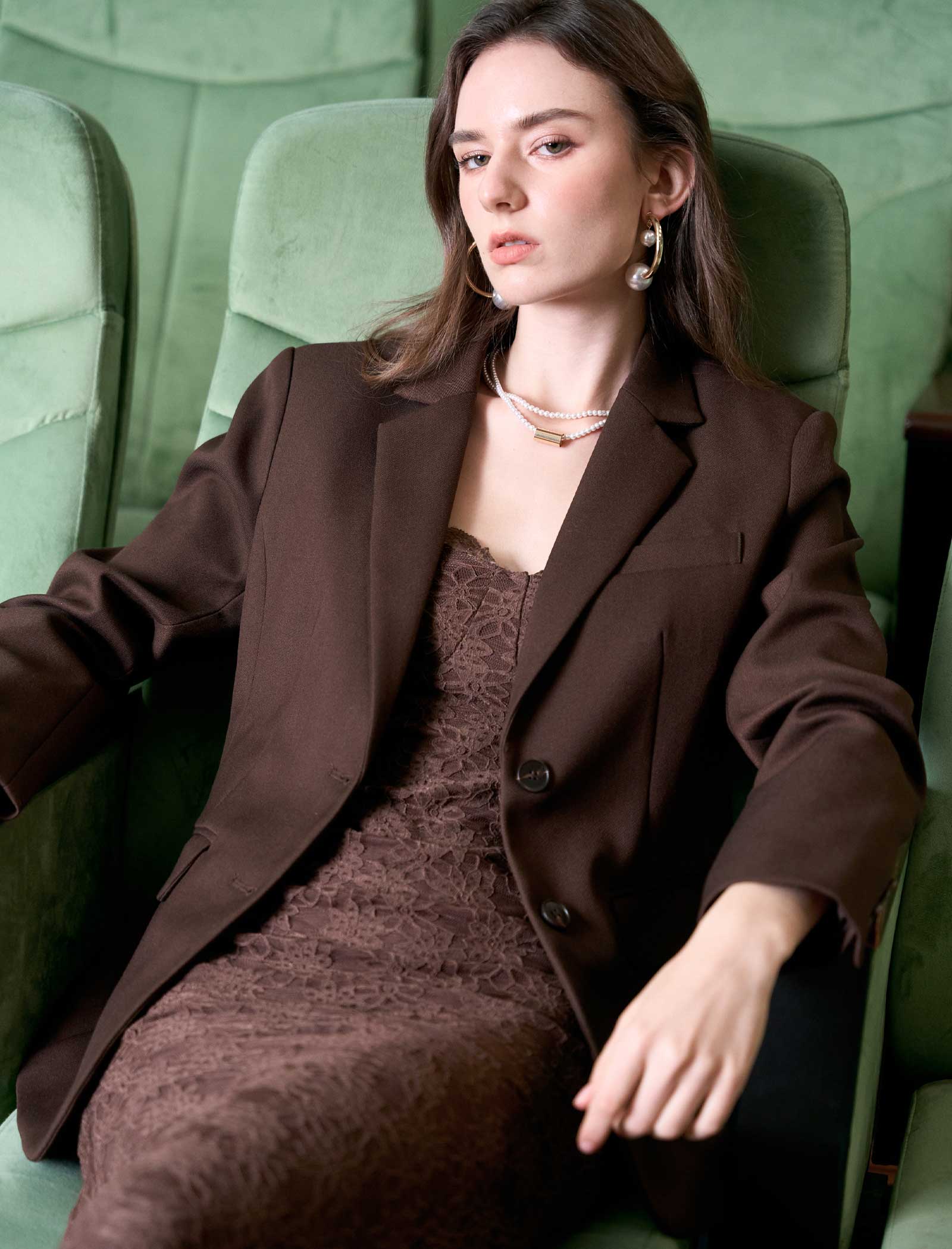 Elevate your evening look with this chocolate brown lace spaghetti strap mermaid maxi dress. It features a scalloped neckline, delicate floral lace detailing, and a figure-hugging silhouette that flares into a glamorous mermaid hem. Perfect for formal events or date nights, pair it with a blazer for a chic, versatile style that transitions seamlessly from day to night.