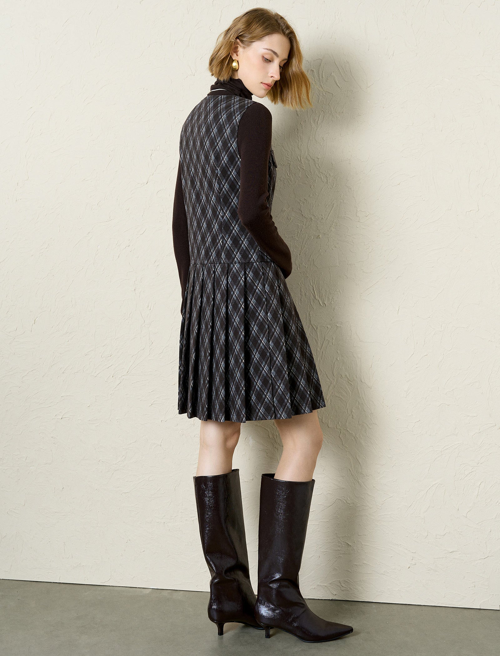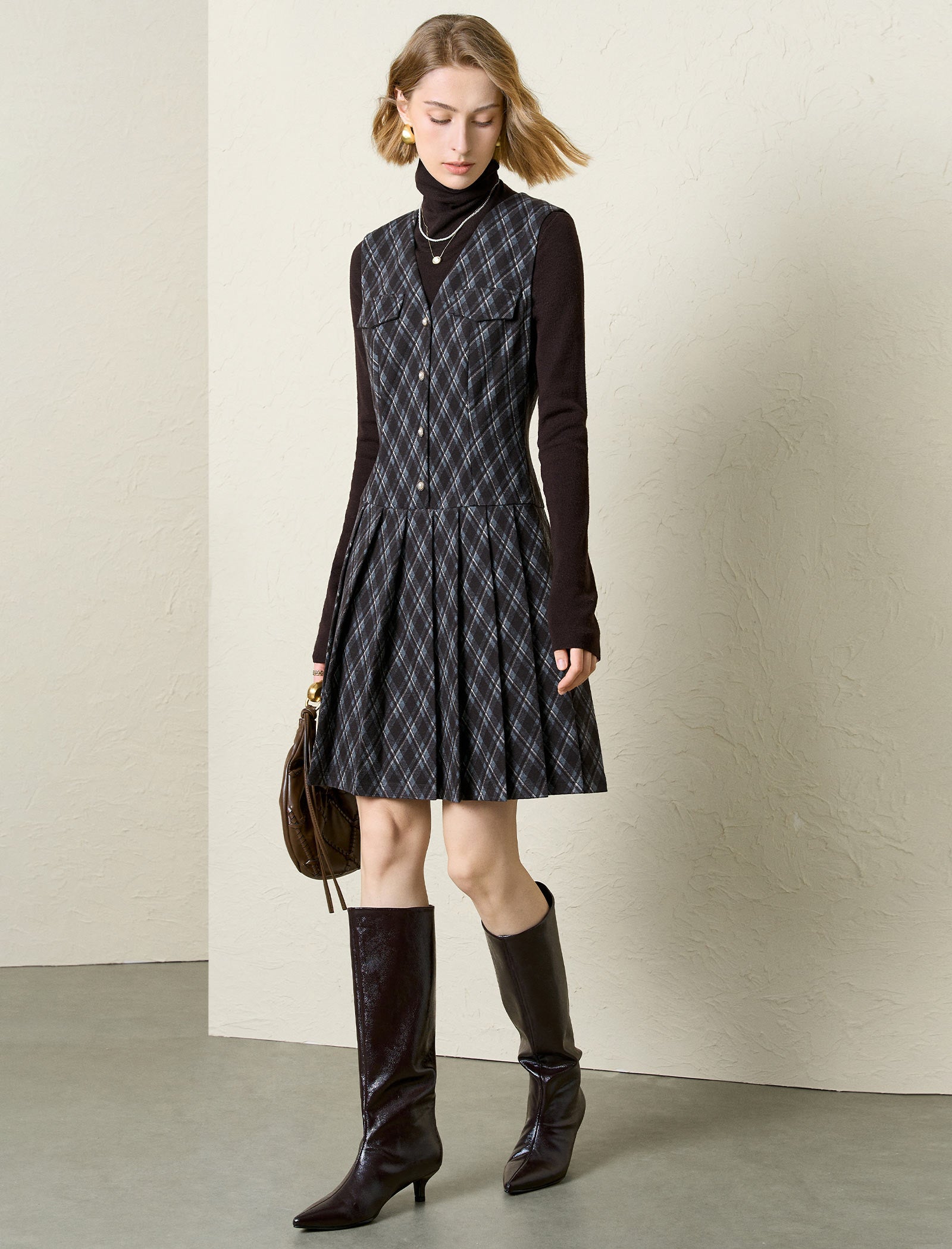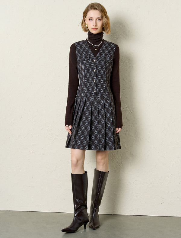 This chic plaid sleeveless mini dress features a tailored V-neck, functional front pockets, and a pleated skirt for playful movement. The button-front design adds polish, while the structured fabric feels cozy yet put-together. Pair it with turtlenecks, boots, or sweaters for brunch, work, or casual outings—it’s a versatile staple that blends classic style with easy wear!
