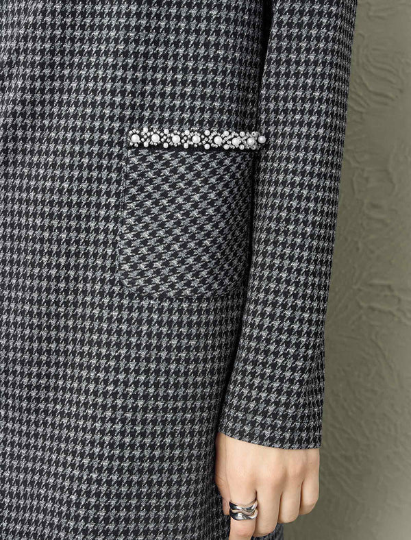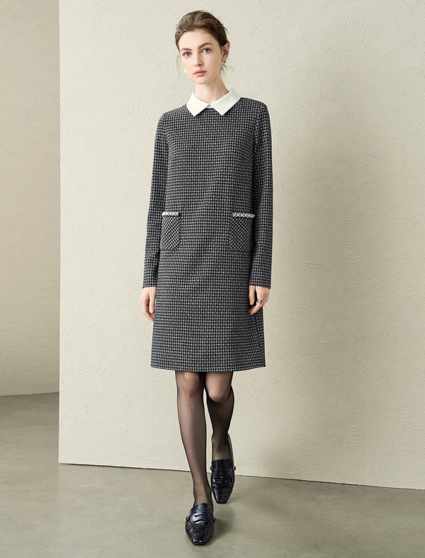 2. Layered-look collar with contrast trim for a modern, chic style.