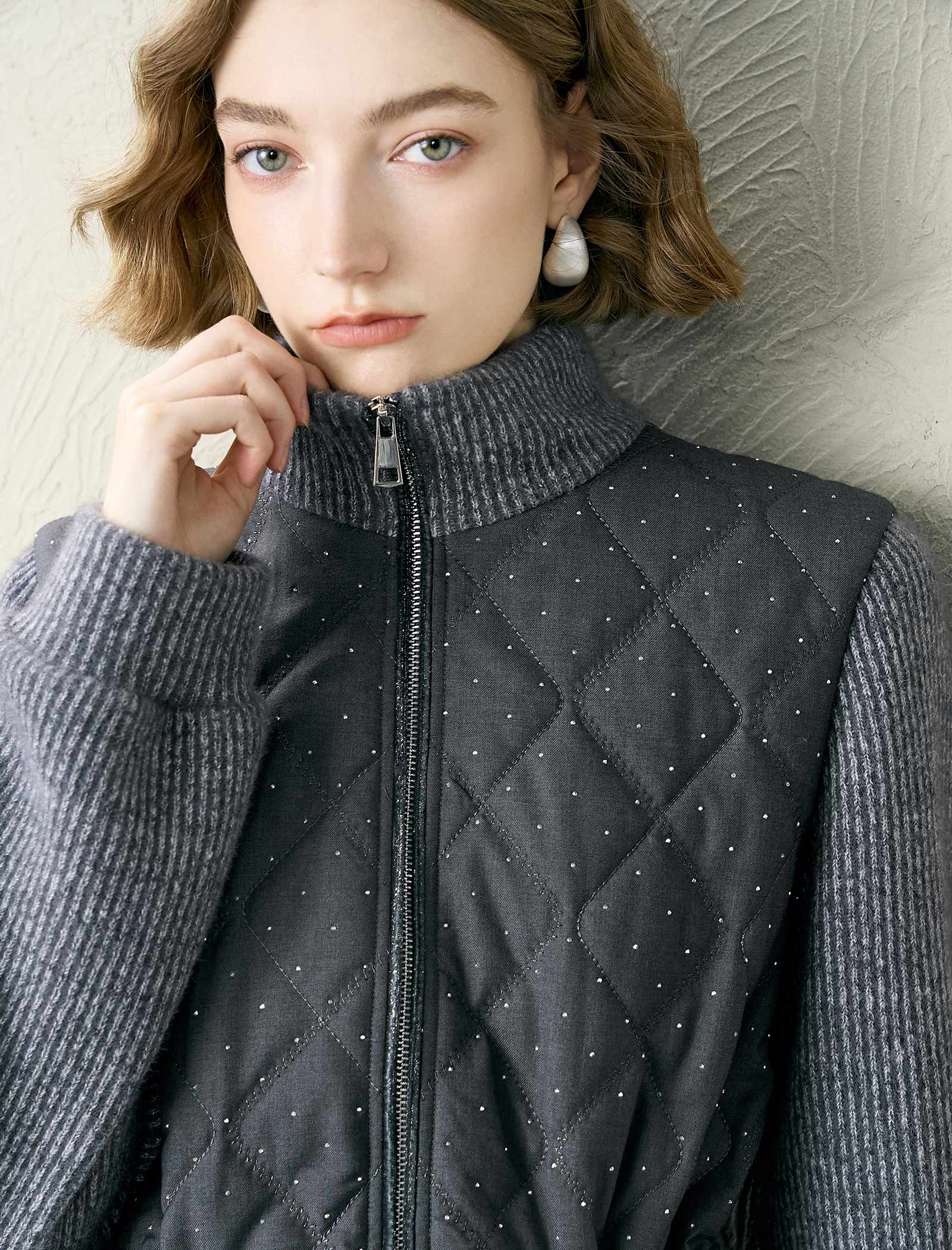 Stay cozy and stylish with this grey quilted jacket. It features a diamond quilt pattern with dot, knit sleeve panels for extra warmth, and a zip-front design. The drawstring waist lets you customize the fit, making it perfect for layering over tops or sweaters. Whether you’re running errands or meeting friends, this jacket keeps you comfy and chic.