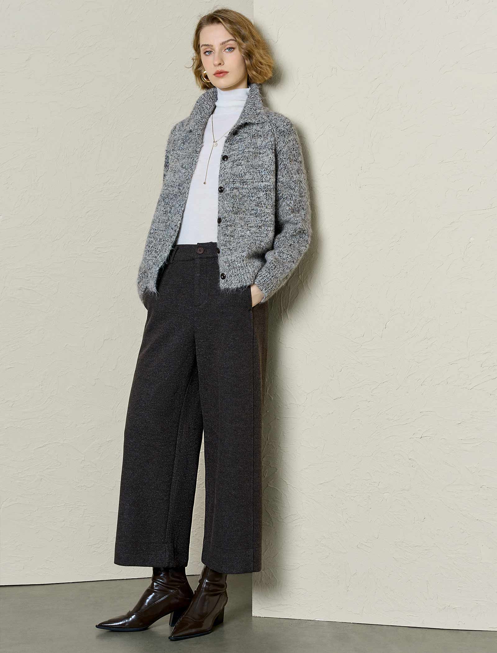 These sleek trousers feature a soft, textured fabric, structured high waist (with a button closure), and a flowy wide-leg cropped fit. Side/back pockets add practicality, while the versatile neutral tone pairs seamlessly with turtlenecks, sweaters, or blazers. Perfect for work, brunch, or dressy casual outings—they’re a polished staple that blends cozy fall style and everyday comfort!