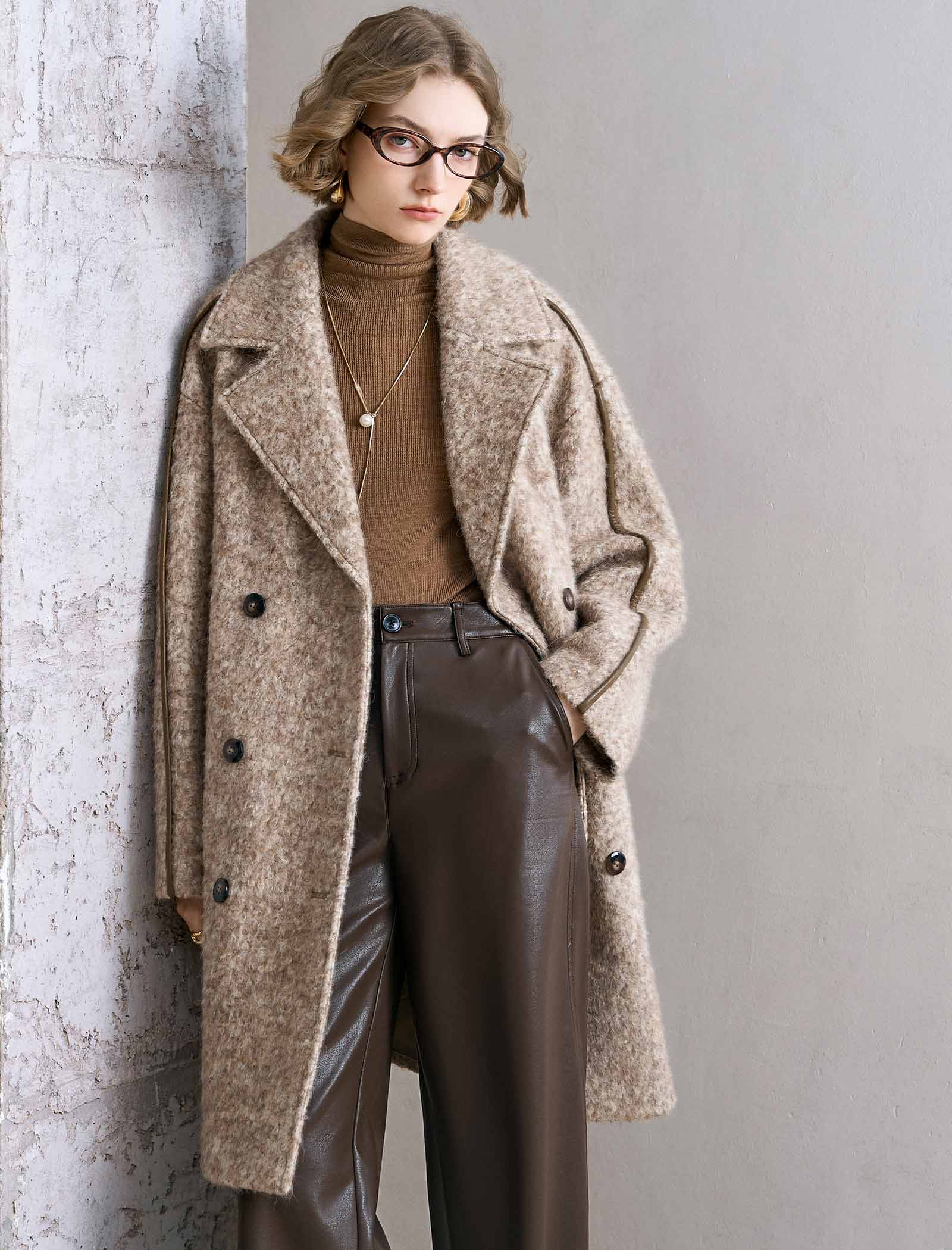 Stay cozy and chic with this tweed wool-blend double-breasted coat. It features a classic lapel collar, a relaxed fit, and stylish contrast trim. The soft, warm fabric is perfect for layering over sweaters or tops on cool days. Pair it with leather pants or jeans for a timeless, fashionable look.