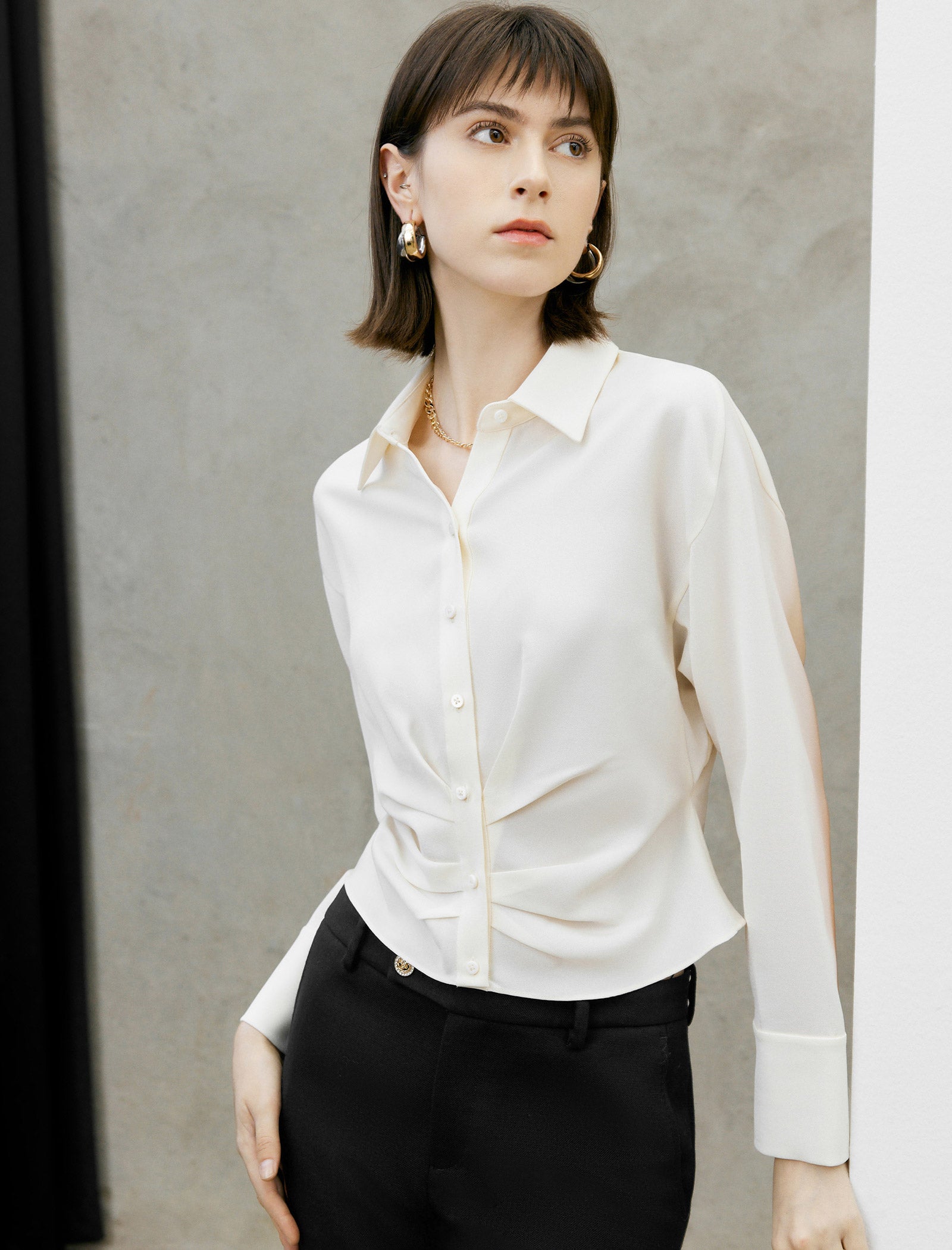 2. Classic pointed collar for a timeless and professional look.