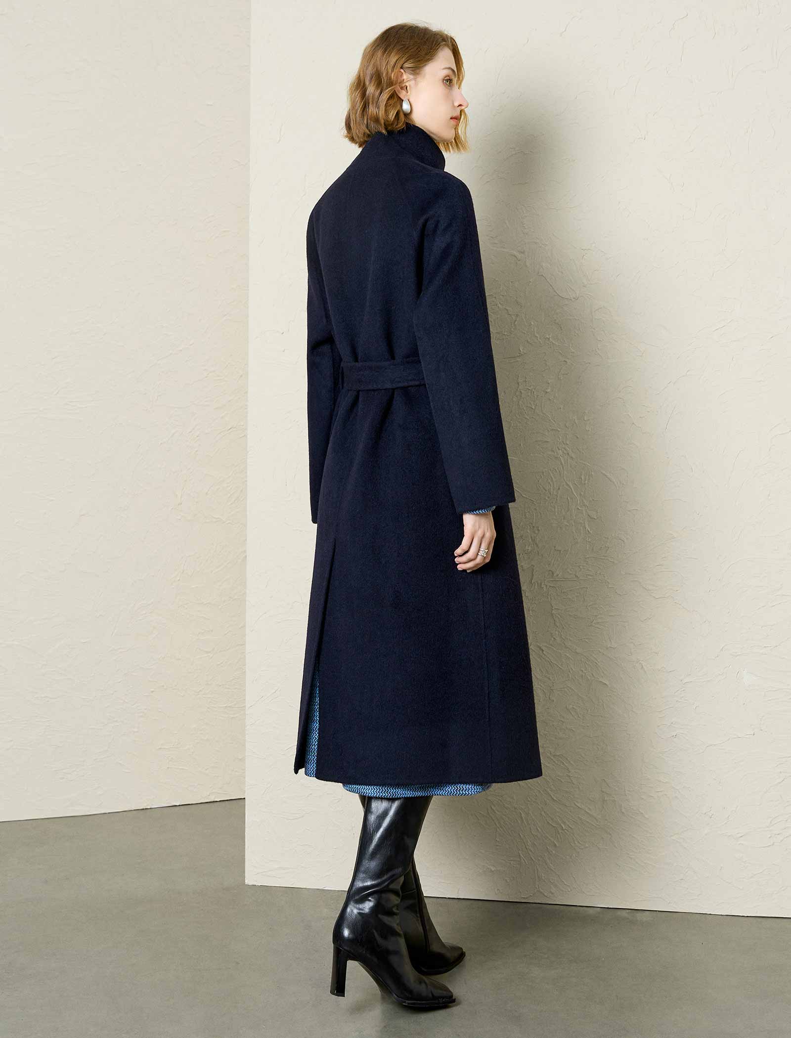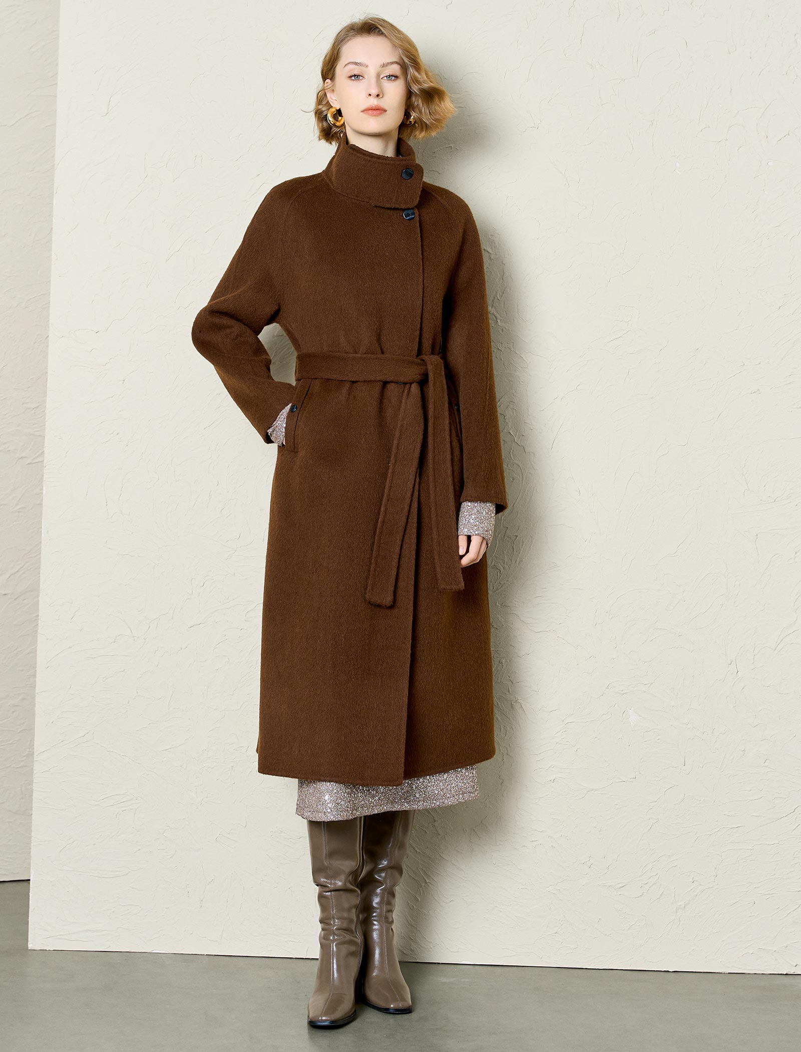 Stay cozy and stylish with this wool-alpaca blend wrap coat. It features a high collar, a tie waist for a customizable fit, and a long, flowing silhouette. Available in brown and navy, this coat pairs easily with dresses or pants, making it a chic choice for both casual and formal looks.