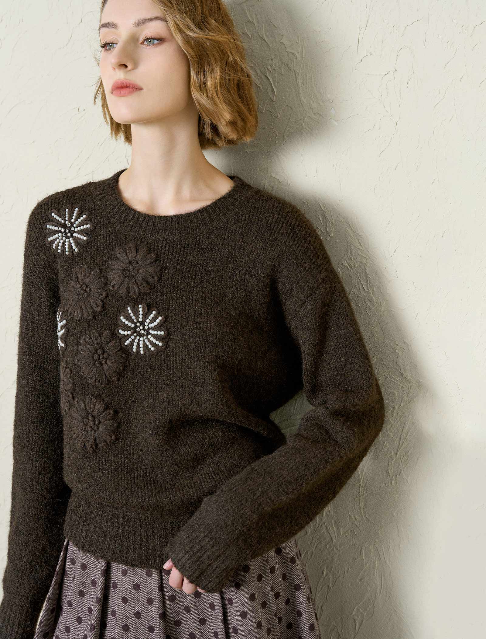 This cozy wool-blend sweater shines with playful details: sparkly firework-shaped bead accents and textured knit flowers. The soft, relaxed fit works perfectly with skirts, jeans, or trousers—great for brunch, work, or cozy outings. It’s a warm, stylish staple that blends comfort and charming flair!